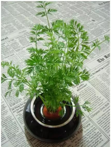 1.切下一大块胡萝卜头部,放在水器中,让它自由生长。最好是放在细长的水器中,这样叶子会笔直地向上生长。