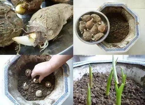 1.把芋头放进花盆,添上土,浇水,静待吧!