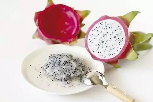 1.将火龙果切成两半,用勺子将果肉刮入容器中。
