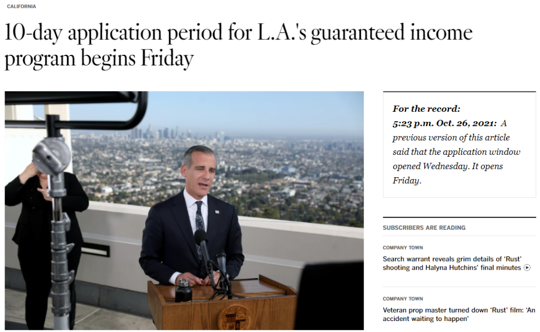 内容摘 美西当地时间10月27日,据多家媒体消息称,由洛杉矶市政厅运营的每月1000美元现金“基本收入保障计划” (Guaranteed Income Program)项目的申请窗口于周五启动,使洛杉矶成为美国推出此类项目的最大城市。
