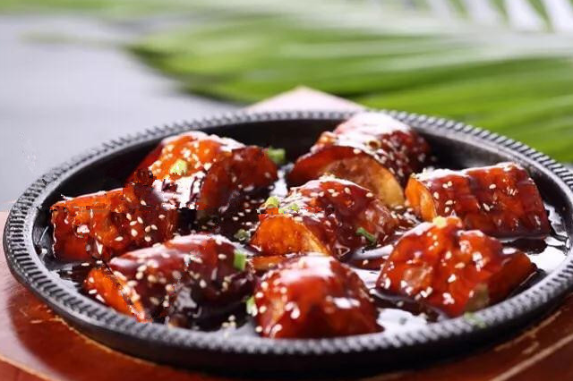 2、烧汁鸭舌 1、鸭舌放入容器内,加入除绵白糖以外的所有调料拌匀,腌制24小时。 2、取出腌好的鸭舌,沥干水分,用风扇吹至表皮变硬。 3、将鸭舌放进托盘内撒上白糖,上火蒸制15分钟,晾凉后盛入盘中即可。 3、烧汁茄子 1.茄子劈开,外皮打隔刀,彩椒切粒。 2.锅加油烧热,下茄子炸至金黄色捞出。 3.锅留油烧热,下葱花、肉馅煽炒出香昧,加烧汁、盐、高汤、茄子烧开,移至小火待茄子烧透,用水淀粉勾芡,烧开即可。