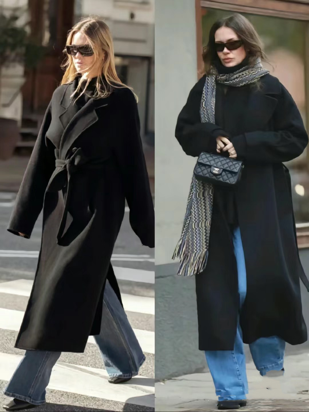 相对于羽绒服的臃肿,长大衣利落又体面,是一种自带气场的单品。日常的穿搭中,经典的黑色长大衣,更是百穿不腻。