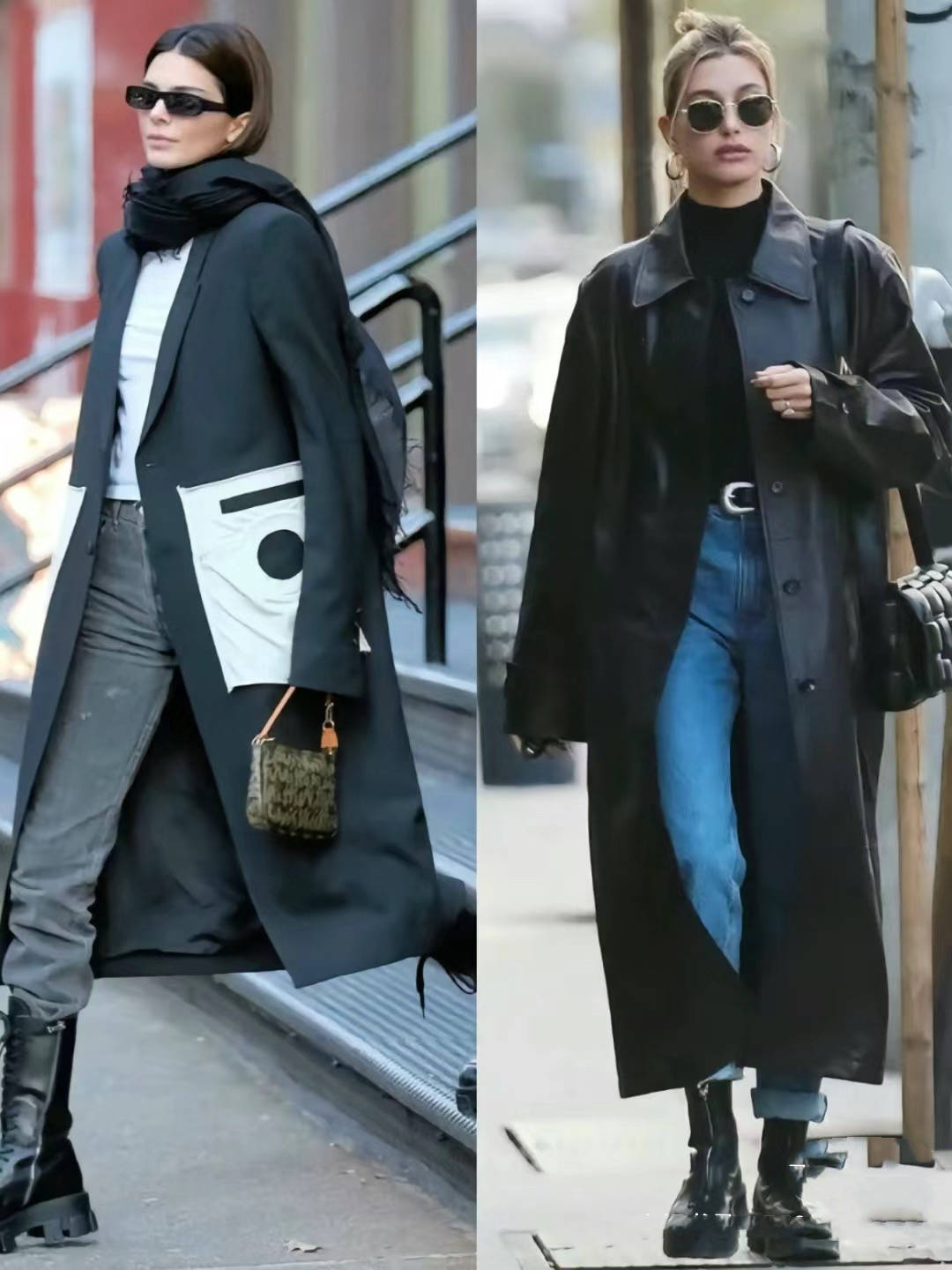 经典的黑色大衣,与蓝色牛仔衬衫+蓝色高腰牛仔裤的搭配,会更加帅气醒目一些。日常的穿搭中,黑色大衣高级犀利,配牛仔套装时髦耐看。