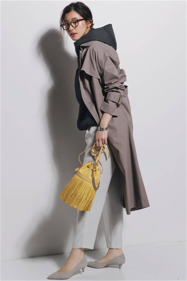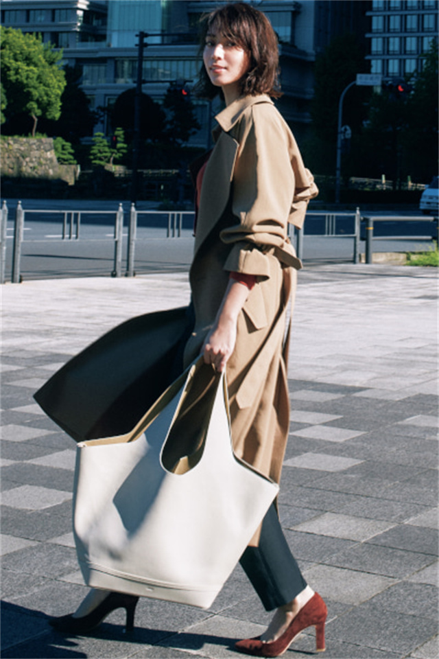 同时,如果喜欢搭配一些简约而经典的手提包,那么这款柔软的皮质手提包是一个很好的选择。它不仅增添了几分优雅,还可以很好地搭配风衣的整体造型。