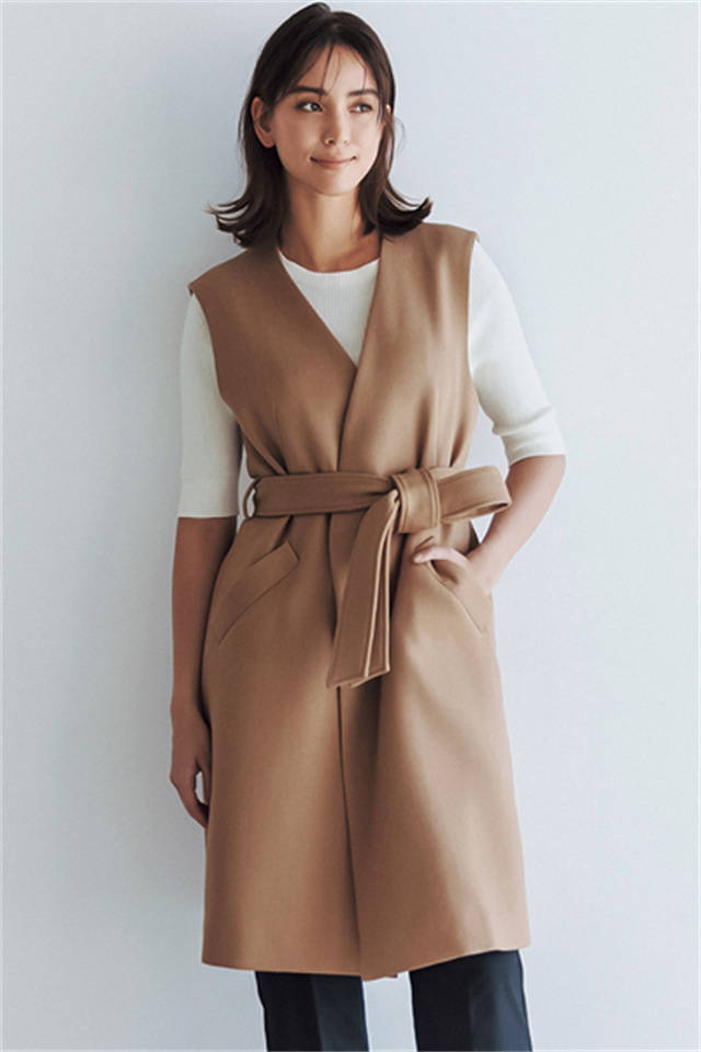 这款优雅的驼色长马甲是时尚搭配的绝佳选择。为了突出它的美丽设计和舒适面料,搭配一条紧身腰带可以使整个造型更为完整。