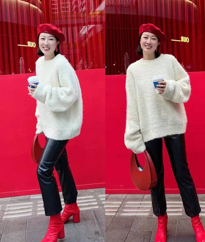 像图中这件白色毛衣,因为是适中的厚度,因此将下摆全扎进腰里,也没有什么问题,但若是材质较厚重的话,这样搭配就不太协调了。