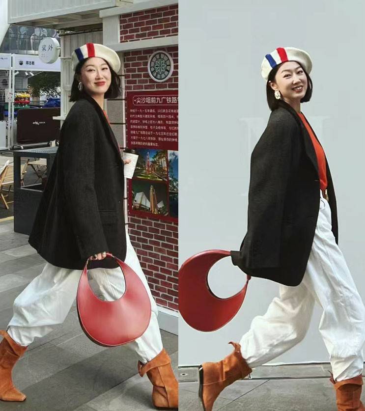 如果中年女性运用的不是基础色款式时,那么贝雷帽在造型中最好能产生呼应感,才不会在视觉上显得过于孤立。因此上图这位女士运用了帽鞋同色的穿法,以首尾呼应的方式,构造出了更强的整体感。
