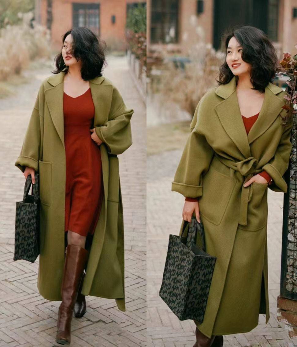 当然很多爱美女性也喜欢搭配连衣裙或是半身裙,像是图中这位博主的穿搭中,就采用了一件牛油果绿色长大衣与红色裙装,非常清晰的勾勒出了富有女人味的娇艳韵味。而对于腿部保暖的考虑,直接搭配长靴,会是比较有用的思路。