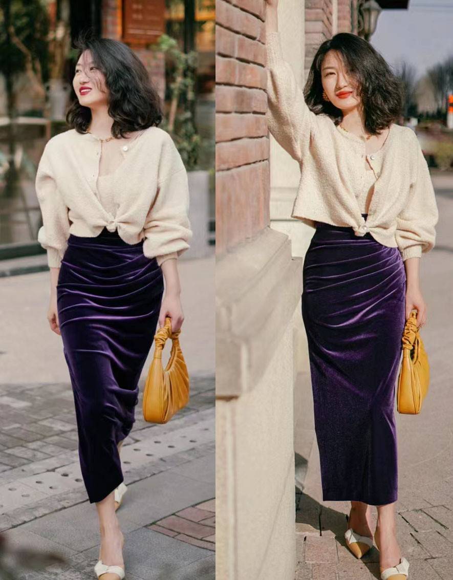 像这身经典的“针织开衫+半身裙”,就将开衫的下摆打了个结,从而实现了腰线的上移效果,而且最主要的是,上下装还有着清晰的色调对比,这对于比例的提升是更有帮助的。