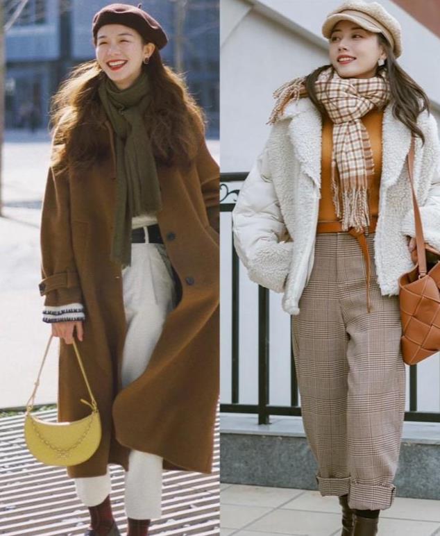 2)颜色呼应法——围巾和外套颜色相同或相近,以协调造型