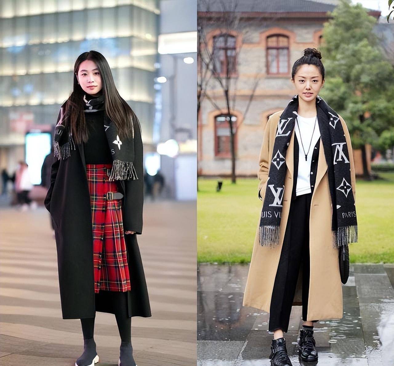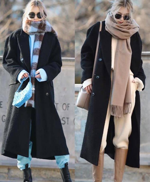如果担心厚重的长外套搭配围巾会让整体造型显得臃肿,可以尝试选择线条感较强的围巾来搭配线条简单的长外套。这样不仅可以在视觉上拉长体型,还能防止臃肿的感觉,显得更轻盈。