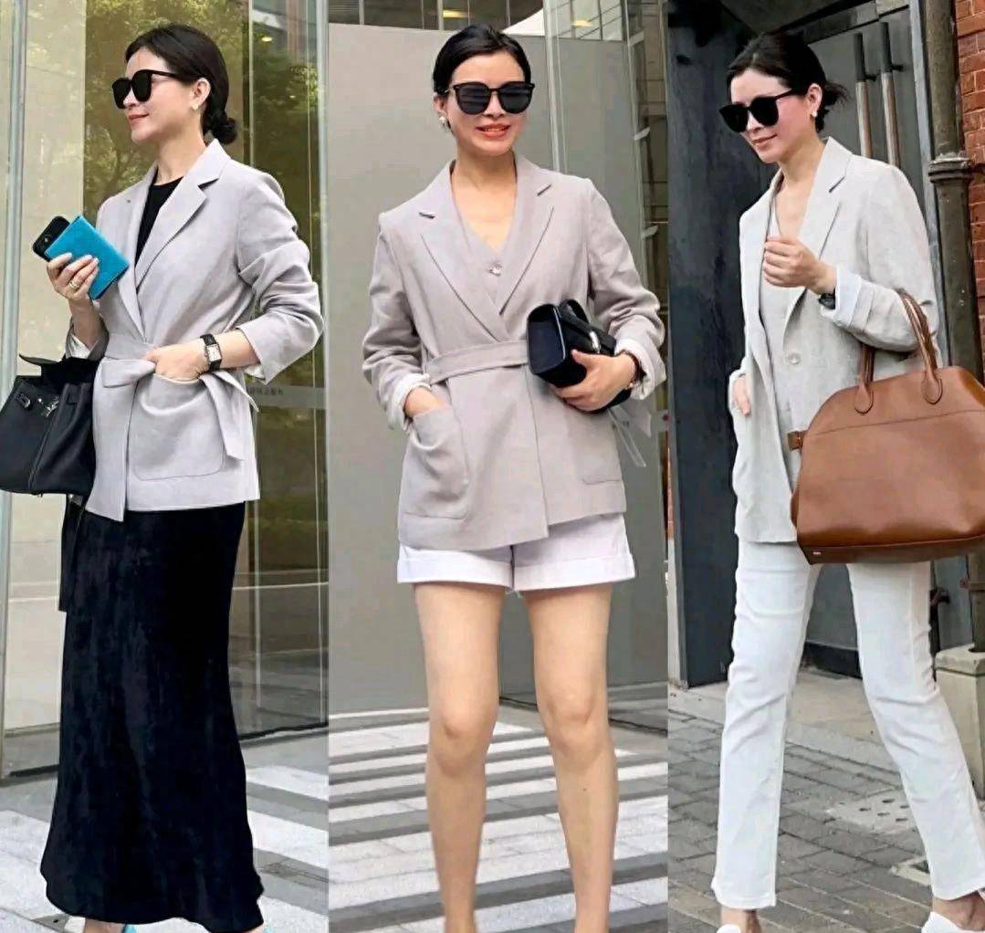 廓形套装的适应性很强。比如灰色廓形套装搭配温柔的黑色长裙,优雅知性的味道非常有女人味。如果搭配白色烟管裤,就是利落的通勤风。 ,搭配漂亮的短裤,非常酷。