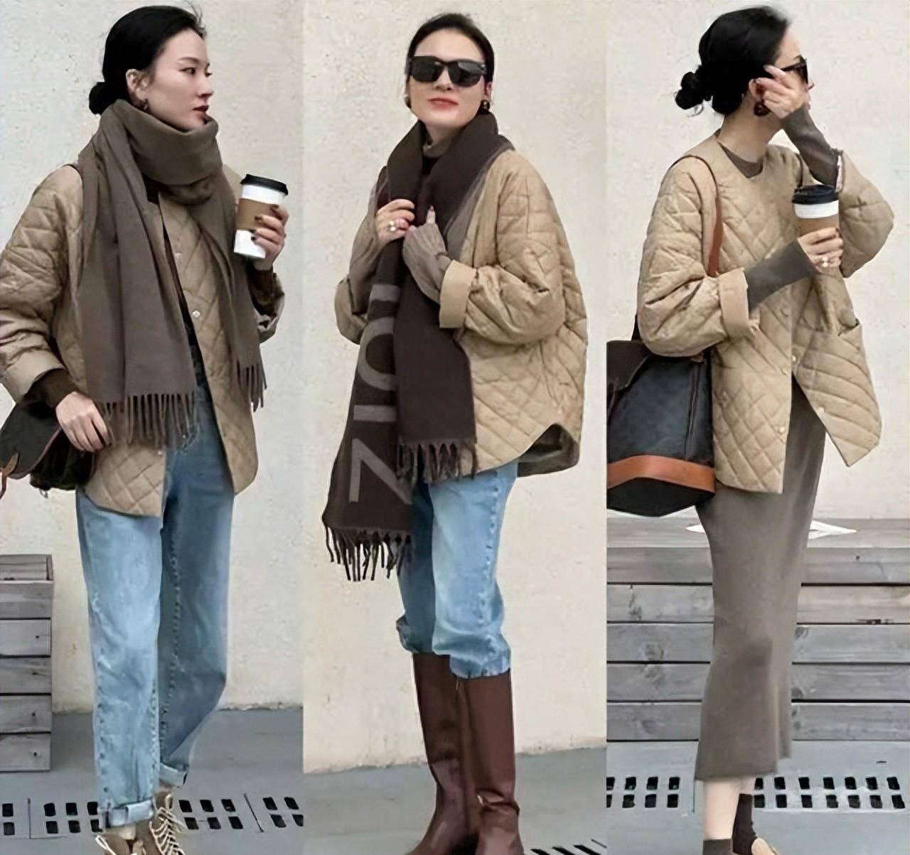 卡其色是强烈推荐的美拉德颜色。比驼色温和,有很好的美白效果。卡其色菱形棉外套简约又舒适。搭配深棕色针织连衣裙。同色系的搭配非常高级。它也可以与蓝色牛仔裤搭配。冷暖色的对比更显时尚。搭配一条棕色围巾,充满了温暖的秋季气息。