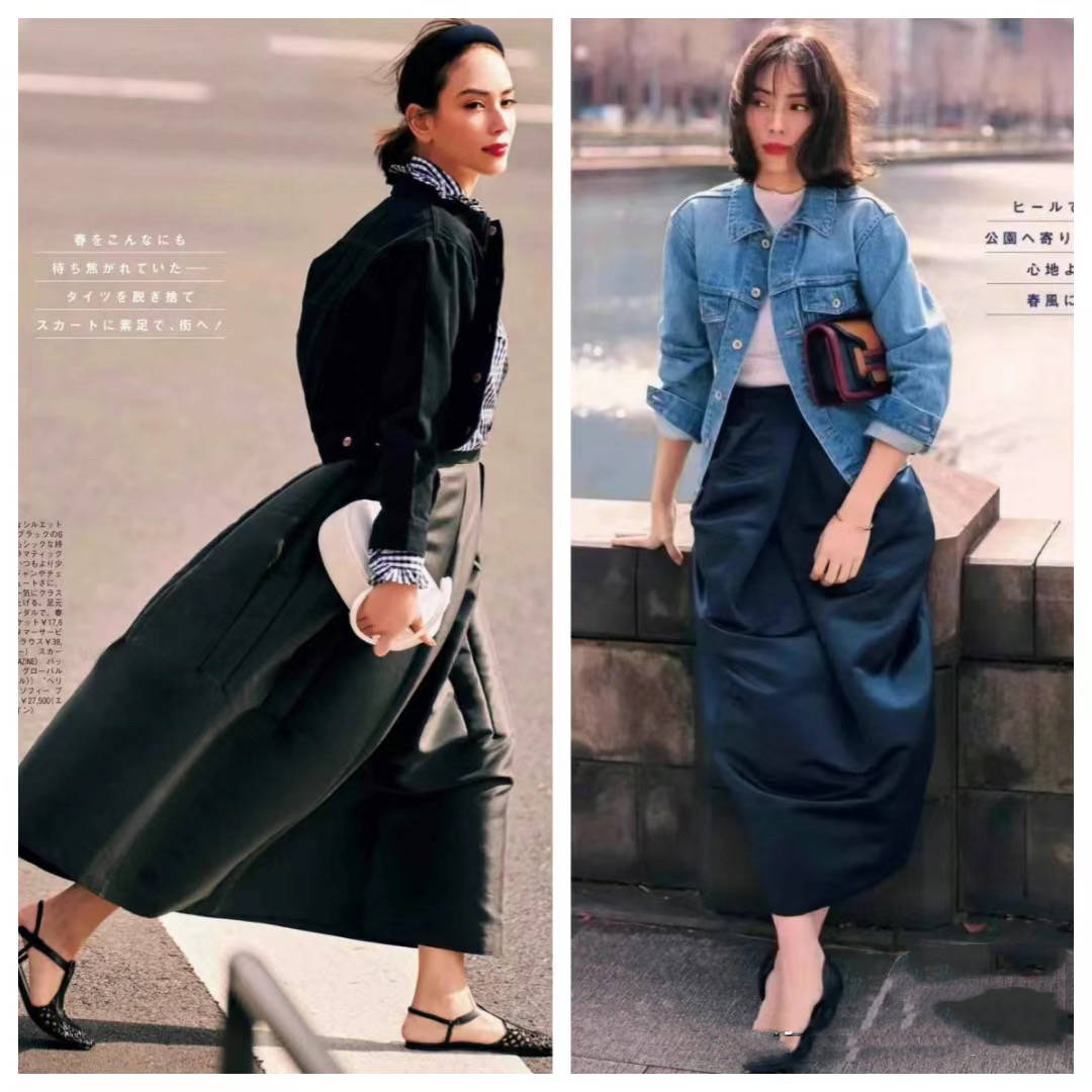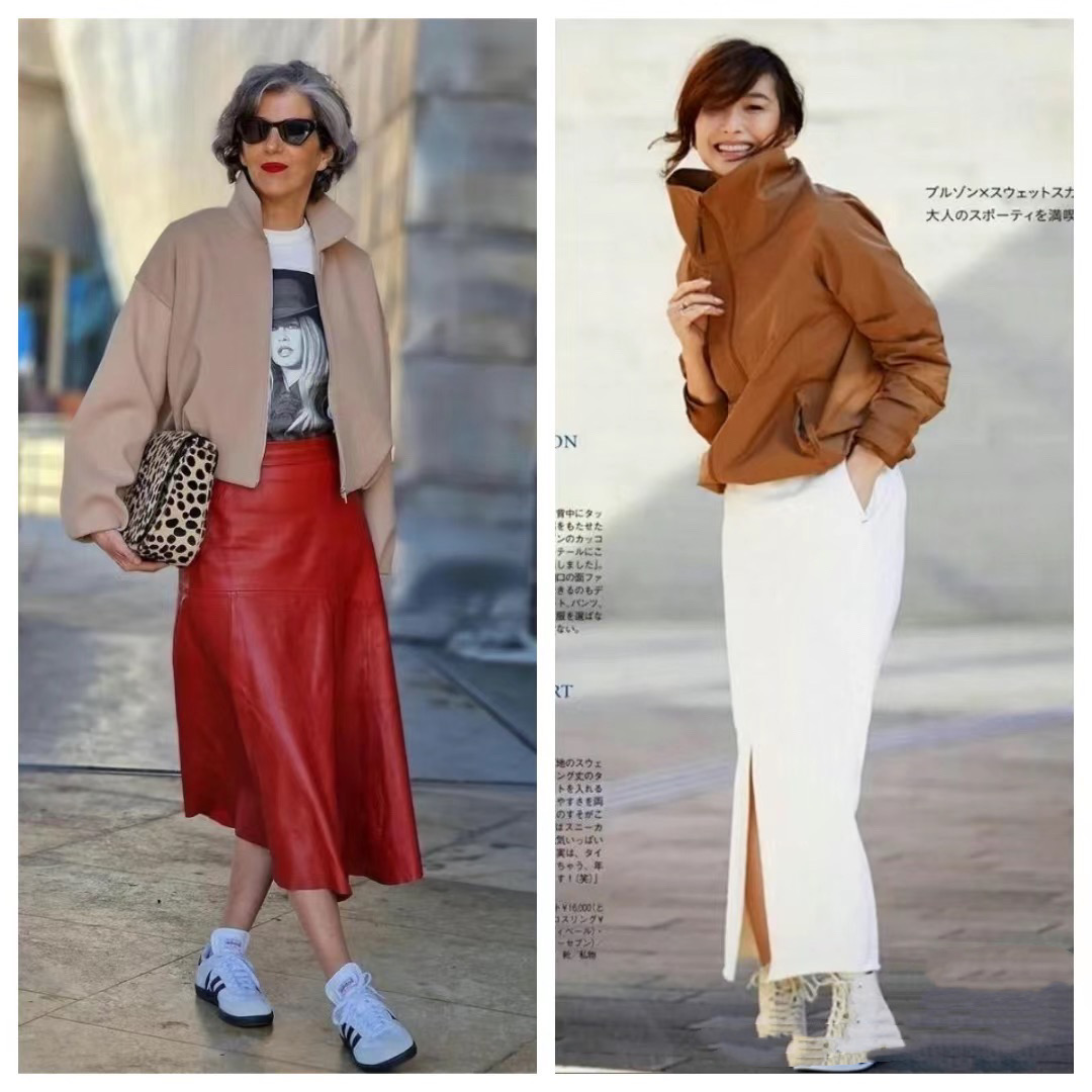 休闲风夹克外套,来搭配半身裙的时候,我们可以参考自己的腿型或者腰臀部的比例,搭配直筒半身裙,或者A字形的半身裙。A字形自然包容性更强,直筒半身裙会更利落。