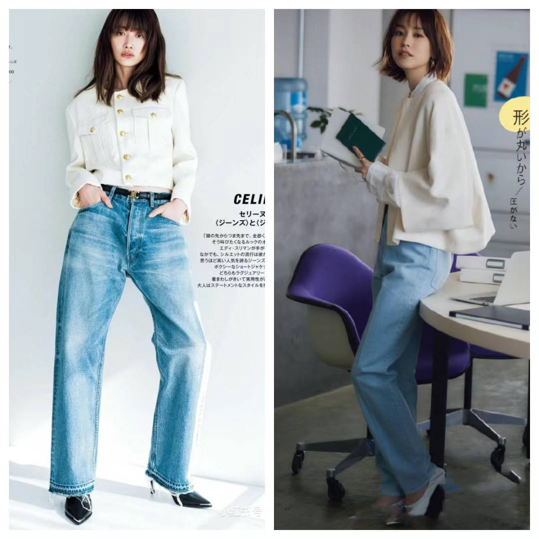 像这种高腰的直筒牛仔裤,搭配小外套穿着,可以显得双腿更加修长。而且稍微宽松的高腰直筒裤,对于双腿具有更强的包容性。