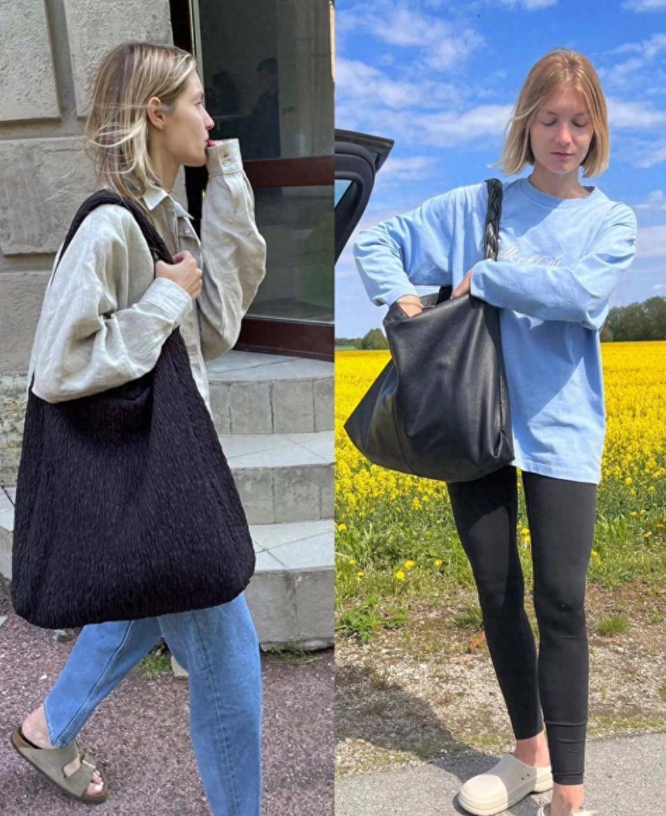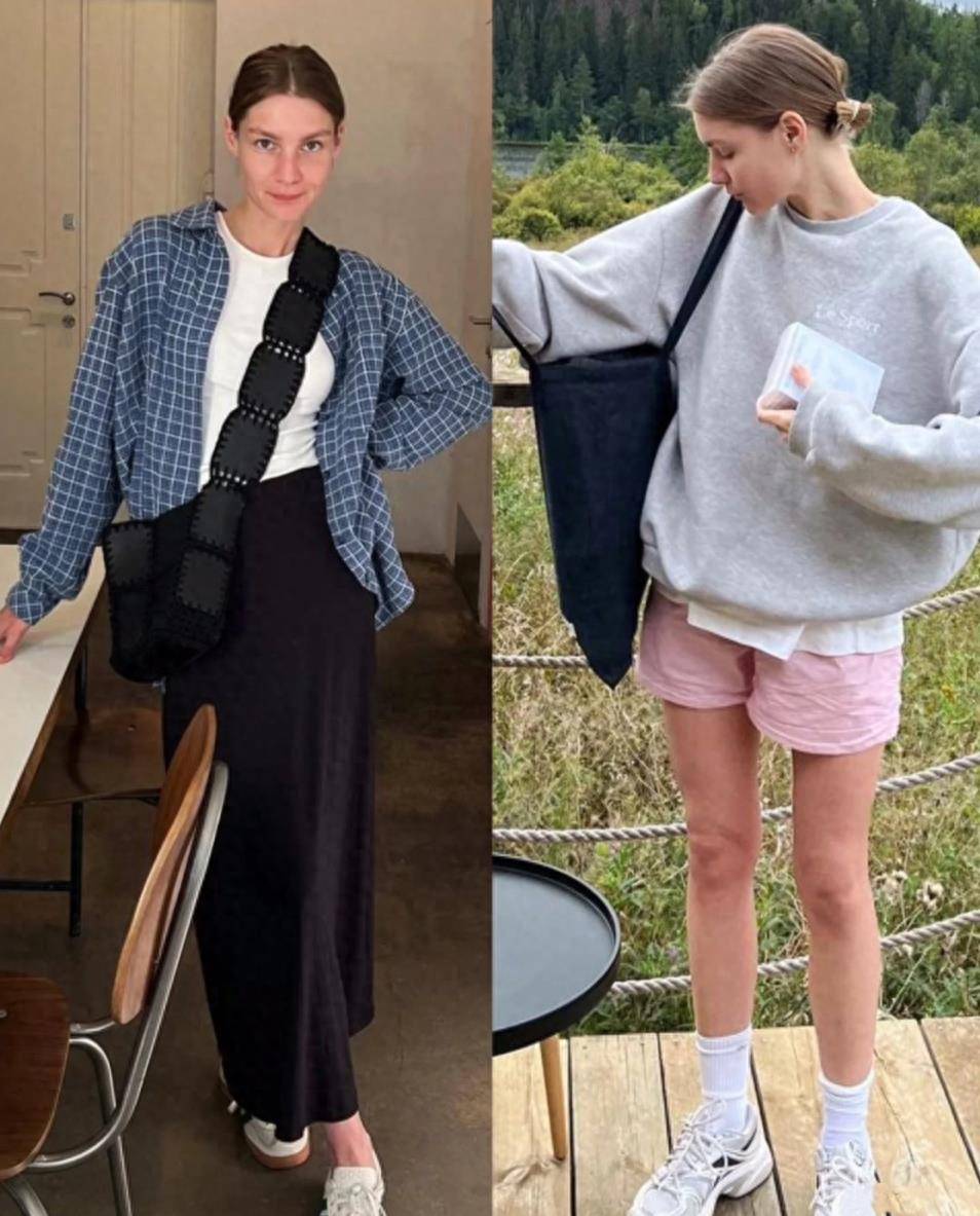 一位Instagram博主还向我们展示了基础款的正确打开方式。灰色卫衣搭配黑色阔腿裤,看上去就是一个普通的路人,但是搭配一个亮橙色的腋下包却可以让它变得更有时尚感。这种比较方法也体现了上面提到的焦点转移规则。这是一种简单的基本样式,上下宽度相同。用存在感很强的亮色包包来增加重心,也能解决中性色的无聊感。