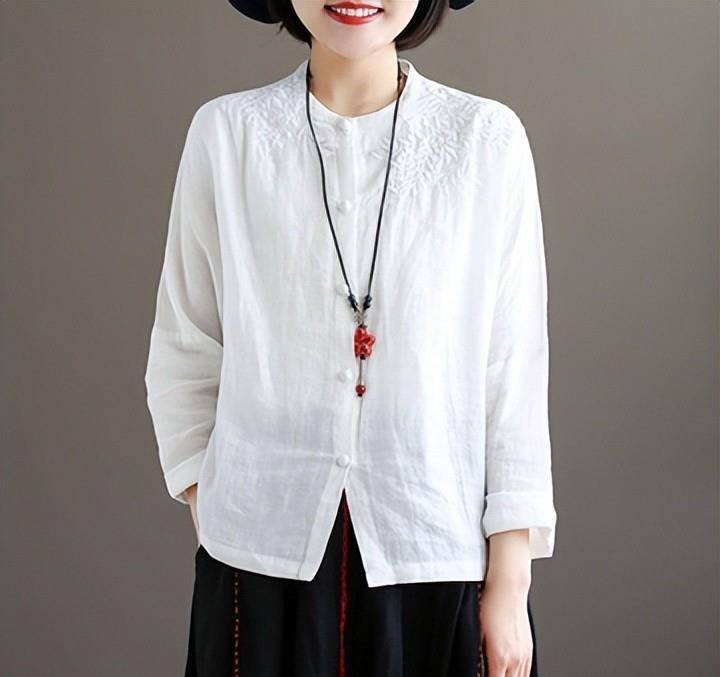 棉麻衬衫虽然穿着方便、耐穿、稳重,但表面没有一些设计,很容易穿起来乏味无趣。可以在衣领、纽扣或袖口添加凸起的刺绣图案,这恰好是流行的新中式设计,是中国女性时尚服饰所独有的。