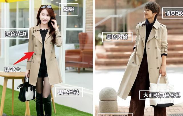 3、避免“精土”:有些物品组合起来很容易出现“精土”。选择墨镜、蕾丝、黑色袜子、哑光黑色靴子等会让你显得娇小,与泥色风衣搭配不合适。建议选择简约款式的着装,彰显个性。