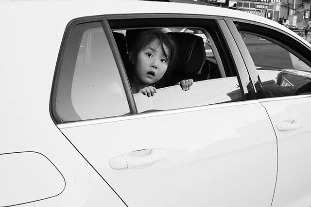 如上图,先对准小女孩附近的车窗框对焦,锁定焦点,等到小女孩摇下车窗向外观看时直接按下快门。