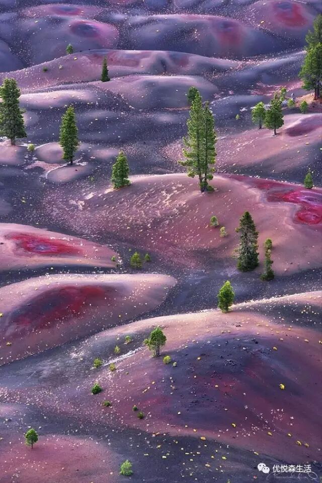 美国拉森火山国家公园,火山坡上的沙丘呈现斑斓的彩色。这是火山活动的结果,美得让人窒息。这一幕像是油画,上帝的画作。