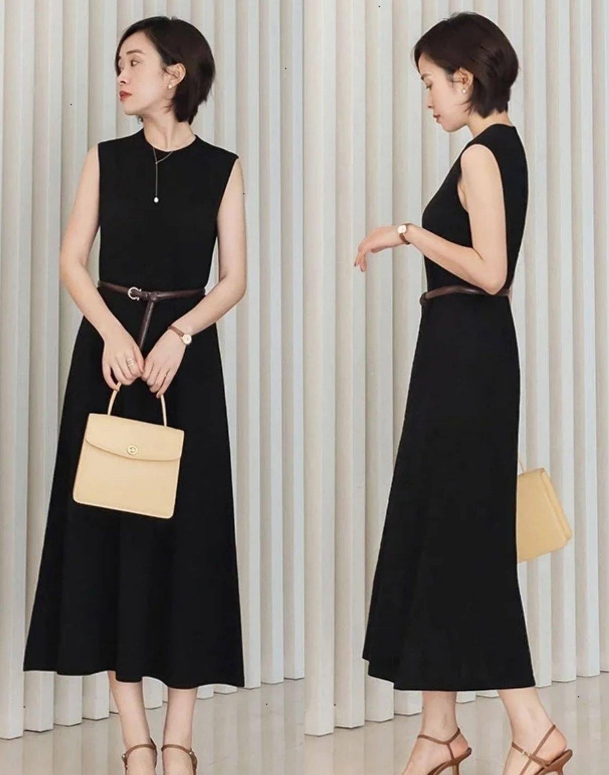 穿及膝裙子时,脚上最好穿高跟鞋。细高跟凉鞋或尖头细高跟凉鞋都是不错的选择,尤其是在职场中,搭配基本款黑色连衣裙时,深色细高跟凉鞋是职场穿搭的完美模板。