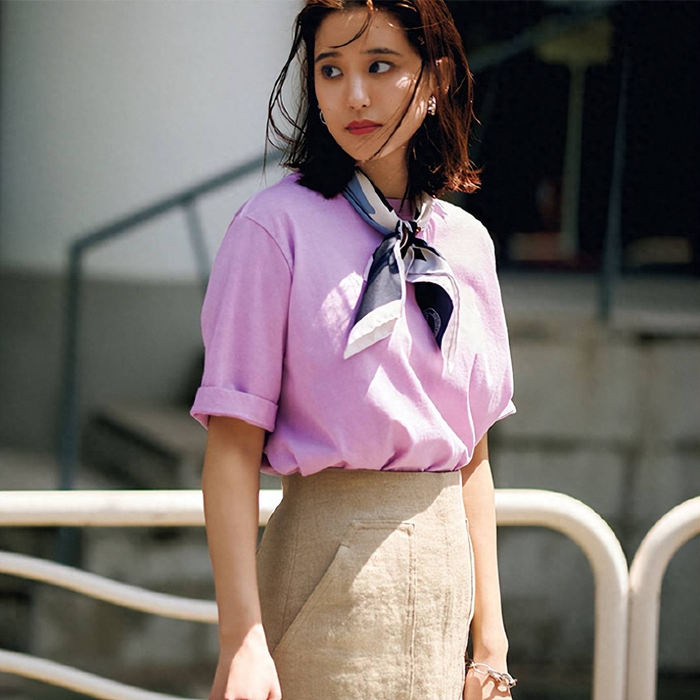 T恤与丝巾的搭配一直是非常经典又时尚的组合,削弱了素色T恤的单调感,增强了造型感。尤其是还遮盖了颈部的细纹,对于人到中年的女性来说也是非常友好。切记避免款式太浅的丝巾,选择低饱和度的颜色可以让造型更精致。