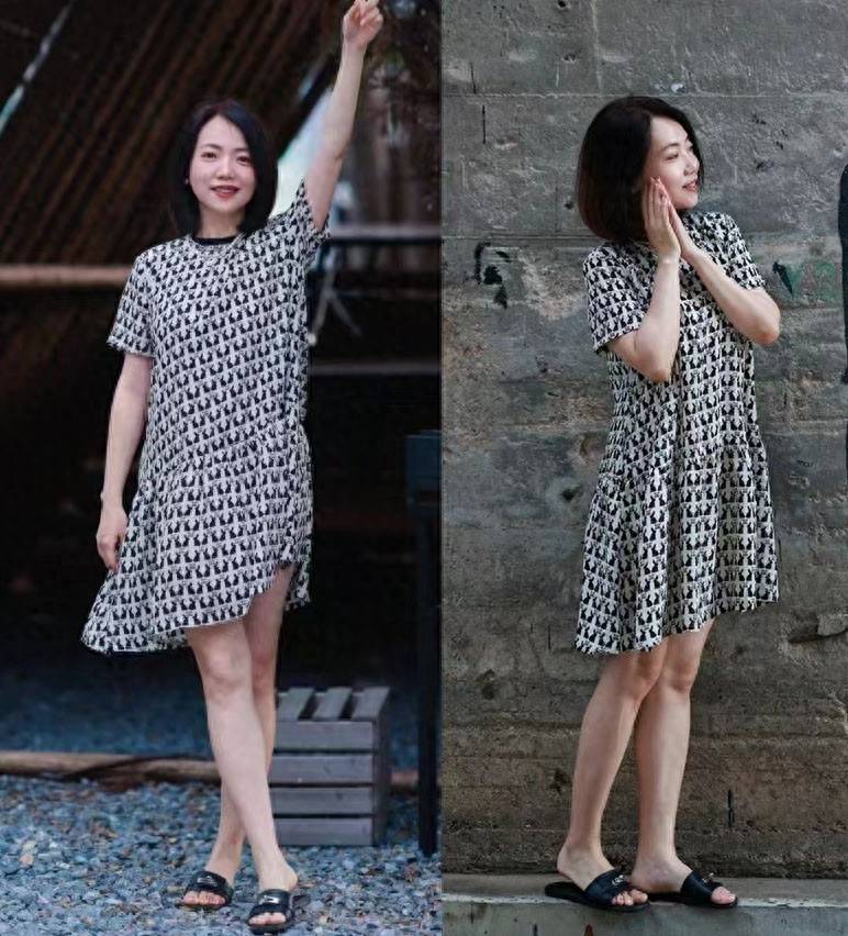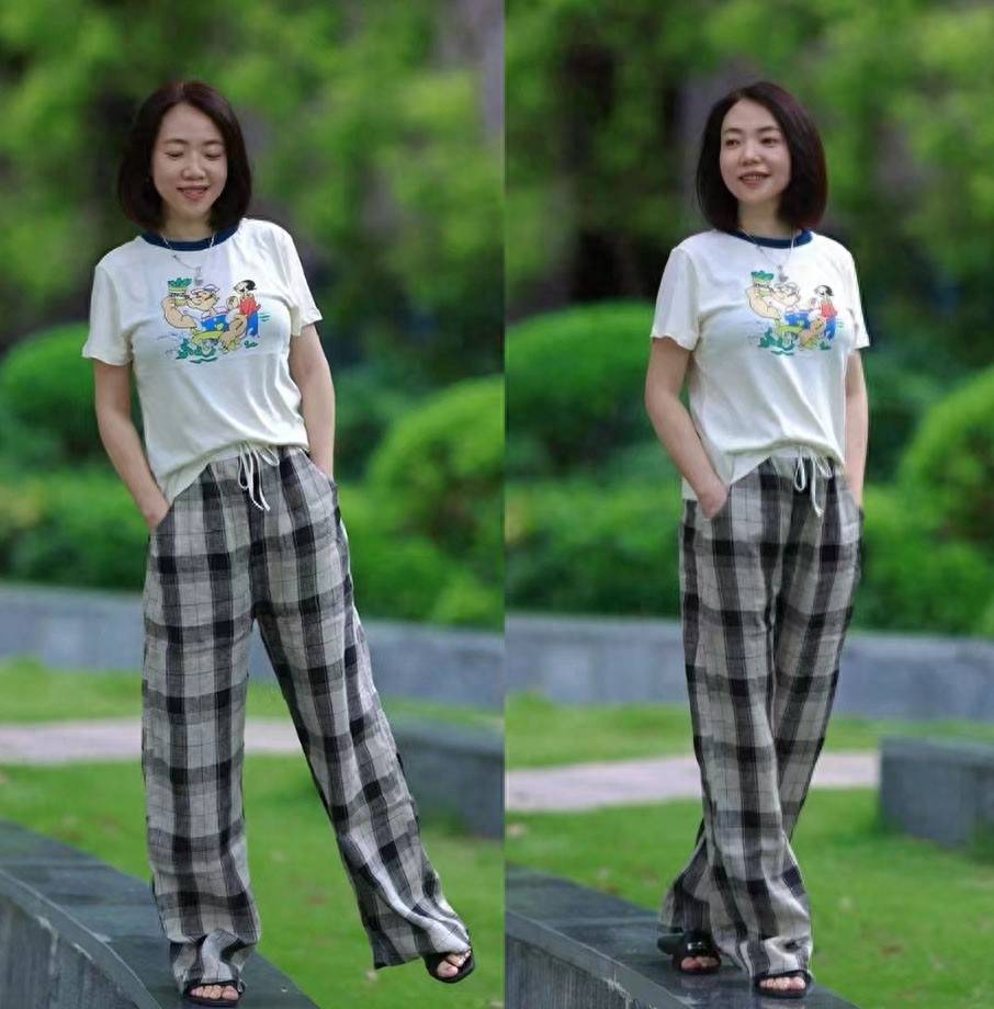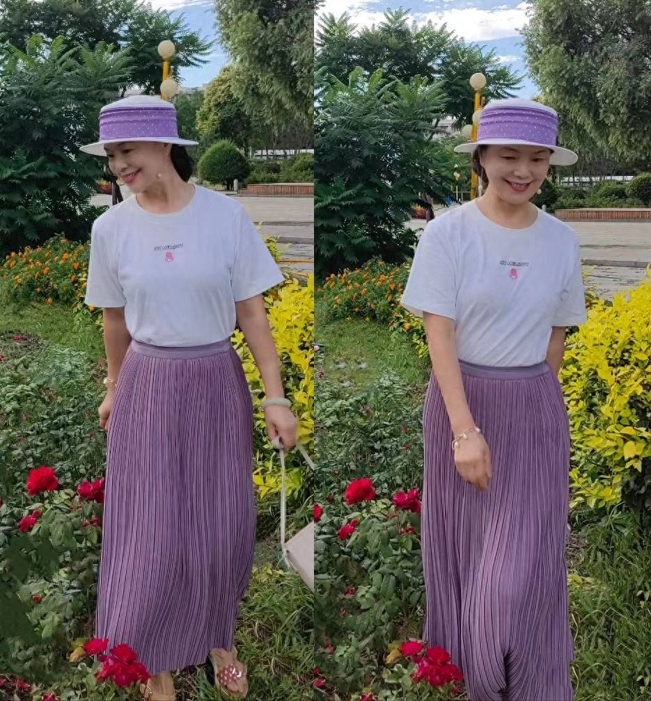 照片中的中年博主缩短了T恤下摆的长度。通过模糊裙子的胯部线条,可以优化实际比例,让身形看起来更苗条。
