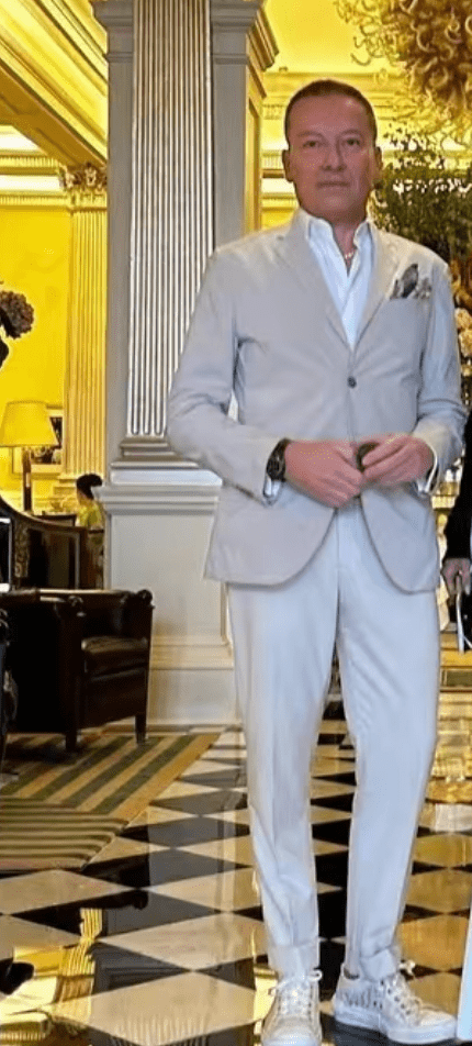 身旁的男士雅痞风十足,内搭的白色衬衫纽扣特意敞开了两颗,配上略带修身的灰白色西装,整个人看上去儒雅绅士,又不失潇洒魅力。