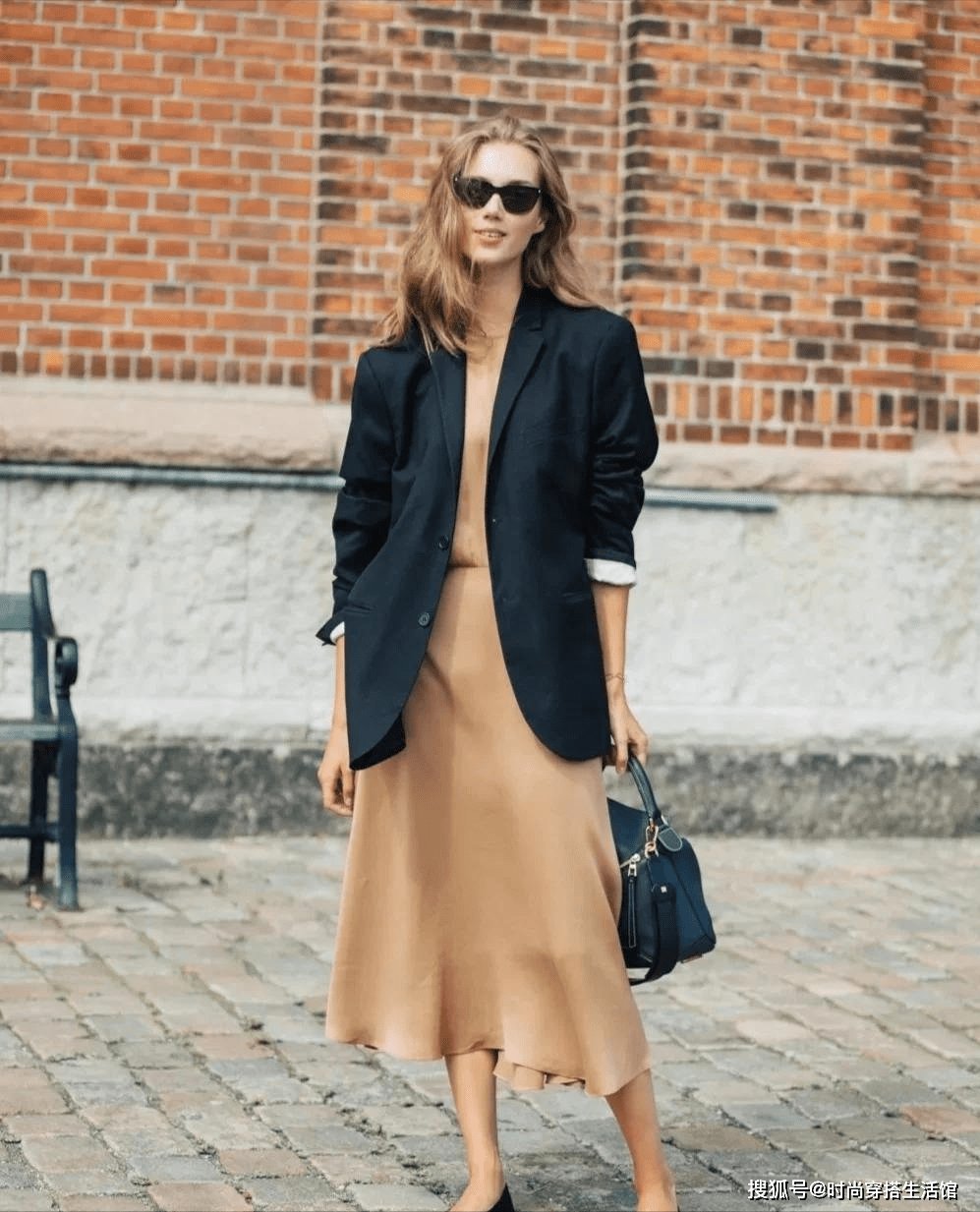 而不管整体的主色调是彩色还是大地色,都要记得全身上下的颜色不要超过三种。比如黑色西装搭配棕色的长裙,其鞋子和包包是与上衣同色的黑色,全身来看,颜色只有2种。