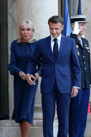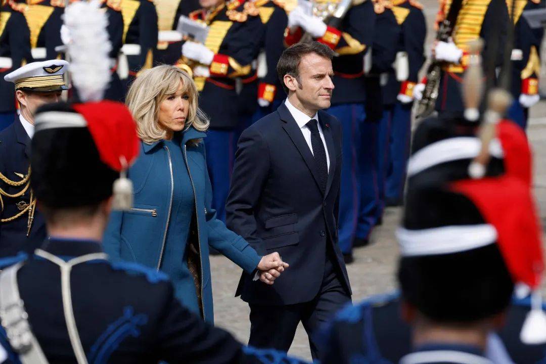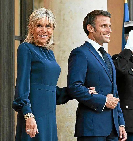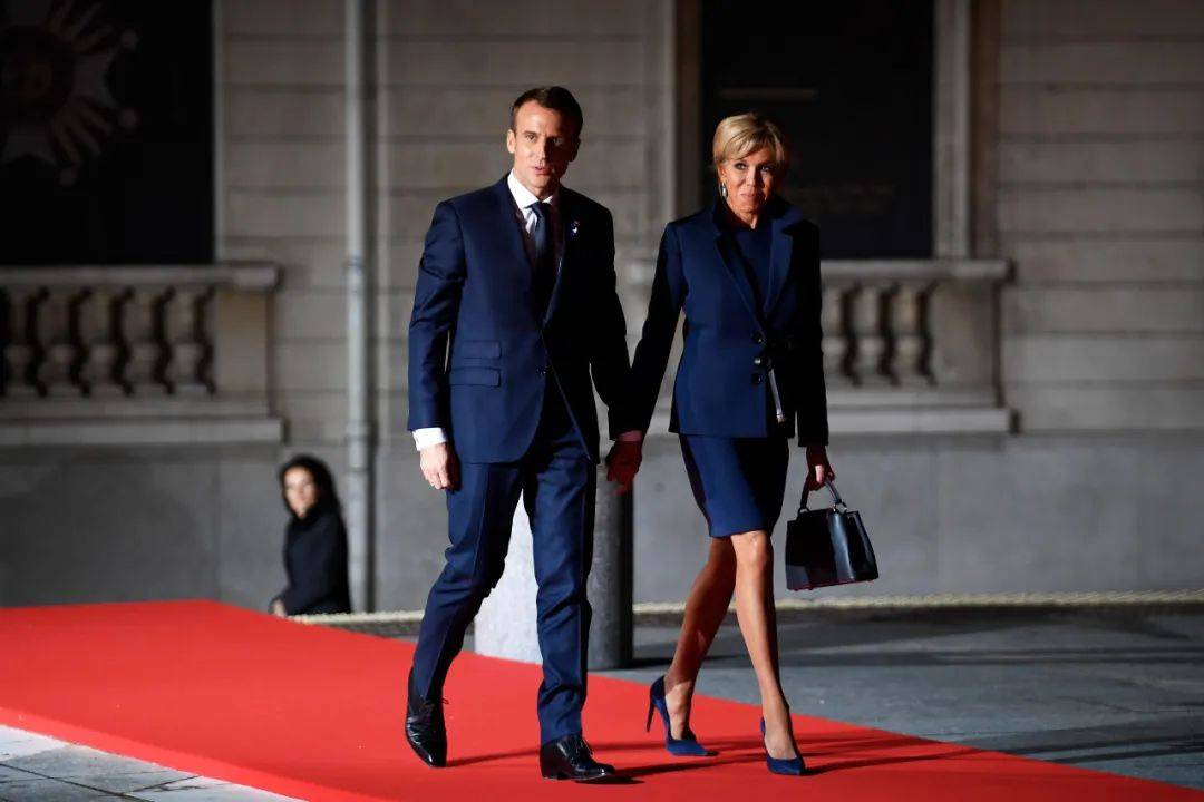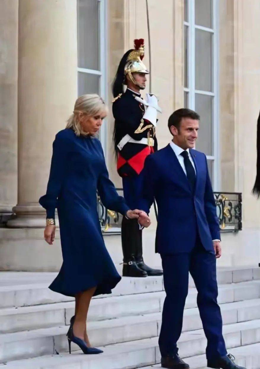 穿情侣色也早已是马克龙夫妇的传统艺能,他俩一起正式亮相,基本上都会在穿衣上打配合,下面这个深蓝装束就非常经典。