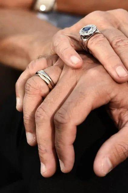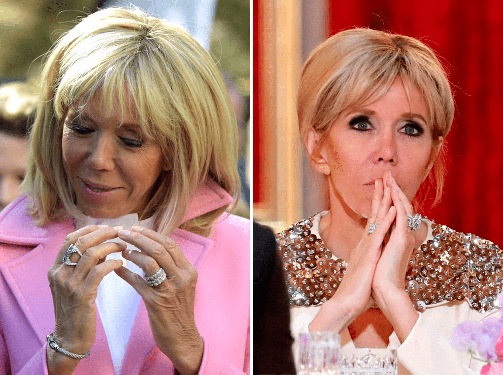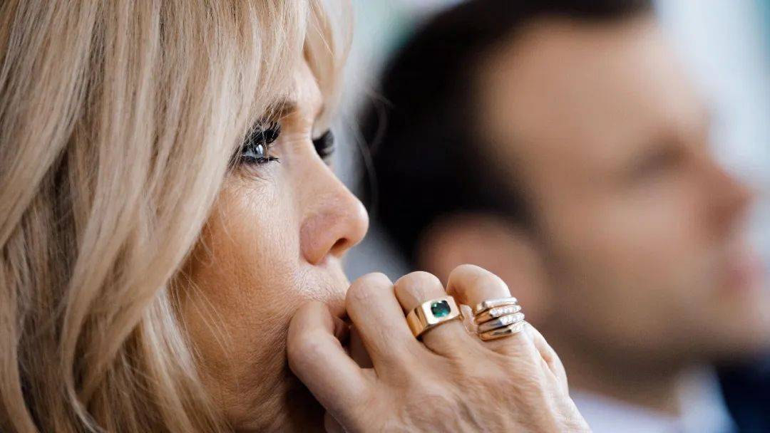 她的蓝宝石戒指,还和马克龙的卡地亚Trinity婚戒一同“出镜”~
