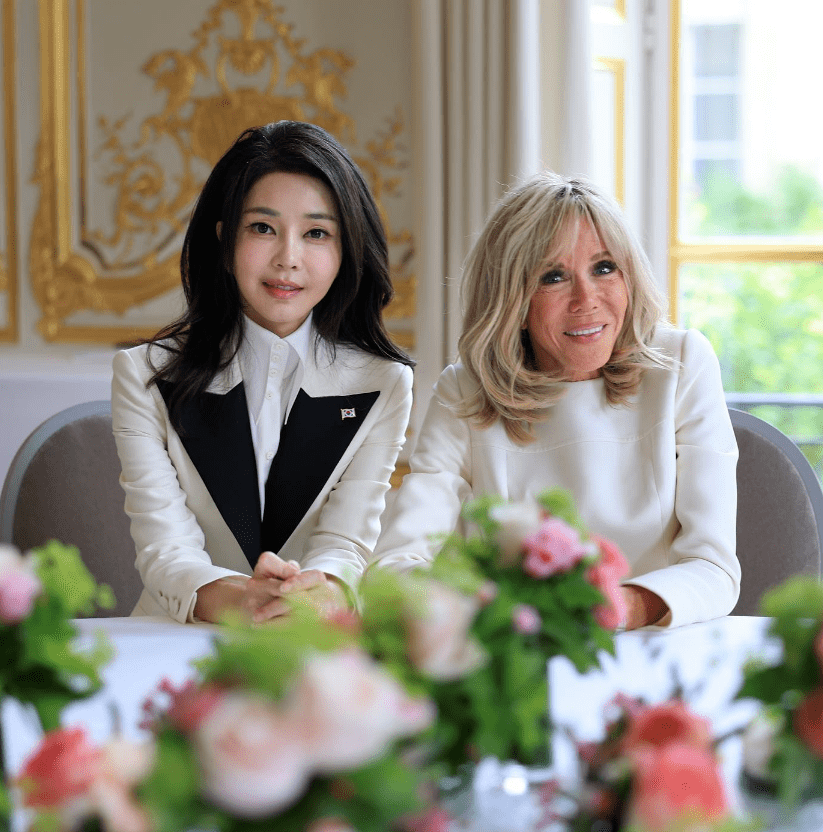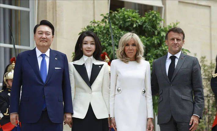 同时也多亏了同行衬托。6月韩国总统夫妇访问法国时,两位第一夫人的合照就被网友拉踩了一番,51岁的金建希的整容脸好似硅胶娃娃,虽然完美无瑕,但是僵硬得如同AI,永远只有一个表情。