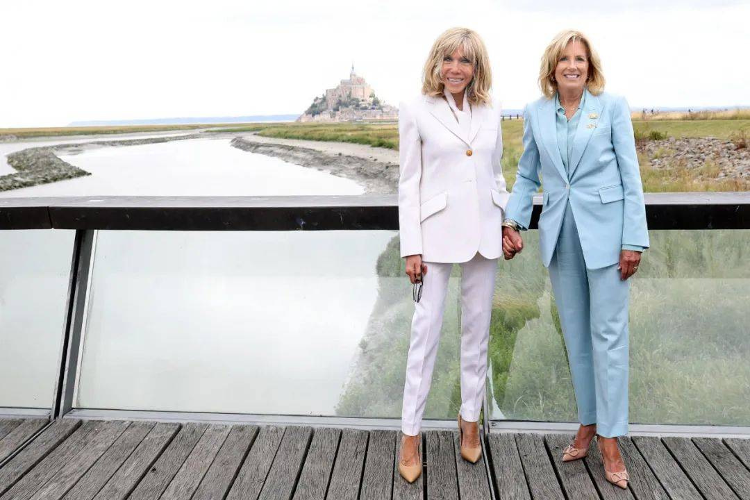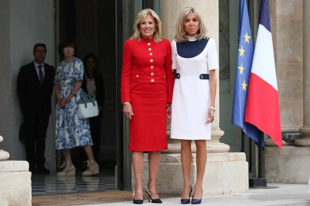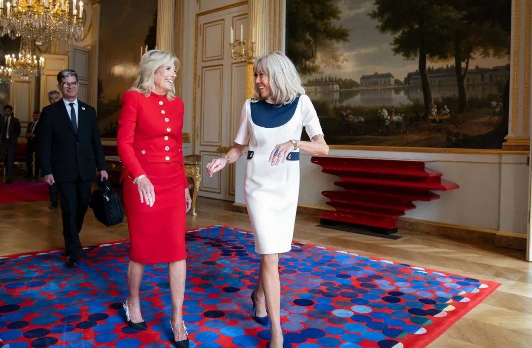 话说小丽近来可以说是连轴转,度假前还在爱丽舍宫接待了吉尔·拜登。一白一红的Look相呼应,同为70+女士,而且只相差2岁,因此相聊甚欢。