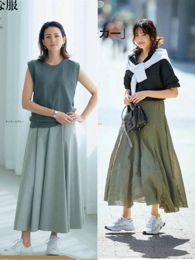 裙子是日本服装中出镜率最高的单品。与20岁的女孩相比,中年女性应该追求质感,所以尽量以直筒单品为主,同时在色彩搭配上尽量精简,可以打造出整体的穿着效果,纵向延伸身体线条。