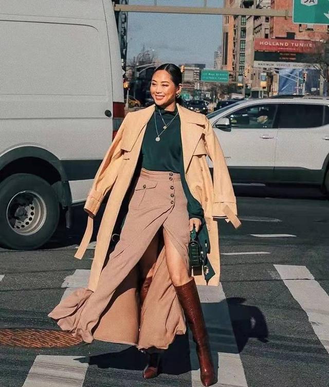 时尚裙子+靴子 裙子采用了时尚款式的设计,本身就具有很强的设计感,而且搭配时尚的剪裁,走路时能够展现出来势汹汹的大长腿,不仅可以强调身高感,还能够增添一份气质。时尚感十足,虽然都是时尚翅膀非常迷人,但是保暖却成了一个大问题,所以需要靴子来防寒,所以外面搭配长款风衣气场绝对很强。