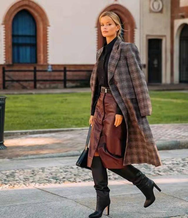 皮裙+靴子 简单的皮裙由于特殊的面料,看起来非常有个性,非常适合春天穿皮裙,尤其是皮裙非常防风,所以在皮衣下面穿一条长袖。裙靴不仅能营造出优美质朴的感觉,还能体现出完美的高级感。职场女性特别适合这种搭配。他们不仅有能力,而且还能展现皇家风范。