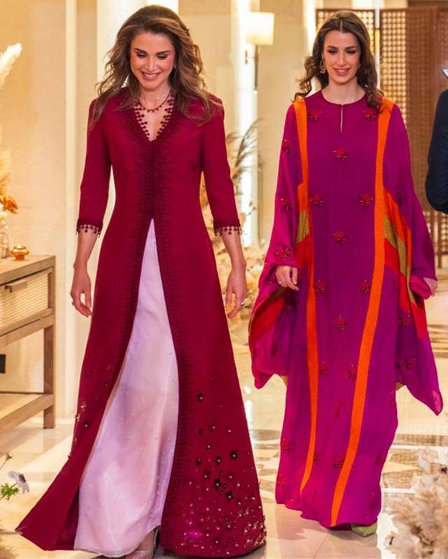 2023年3月7日,在女儿伊曼公主婚礼派对上,拉妮娅王后穿着红色和粉色的连衣裙,看起来很有王者风范,她和她未来的儿媳妇一起参加了聚会,服装也很协调。