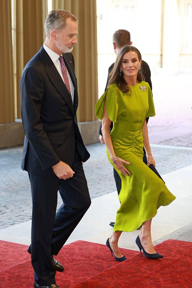 2023年5月5日,对于一个白金汉宫加冕前招待会,的西班牙女王身着绿色维多利亚·贝克汉姆礼服惊艳全场。