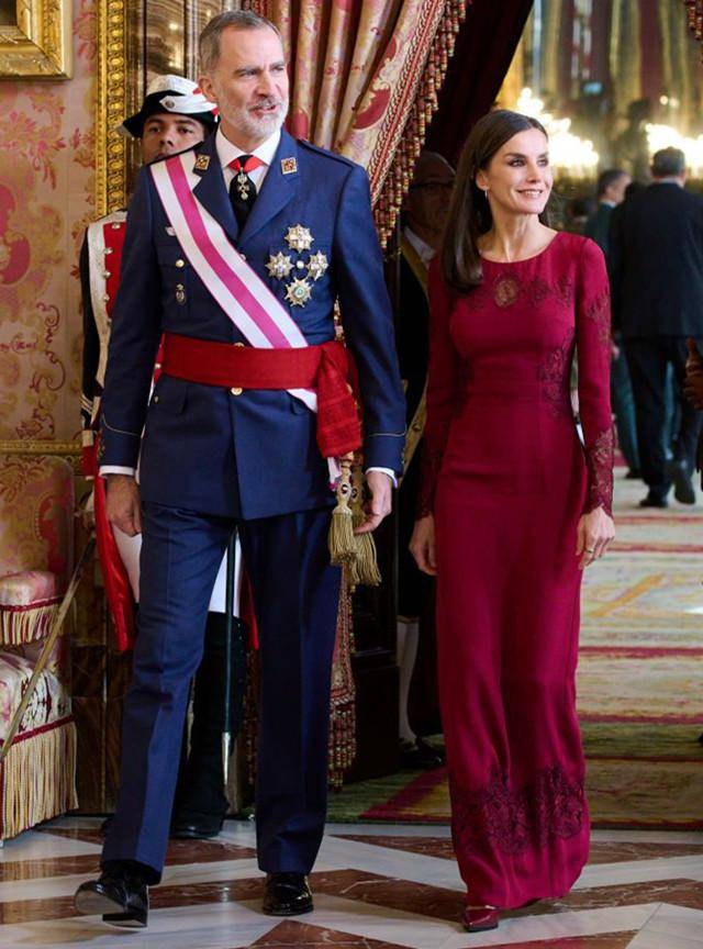 2023年1月6日,在皇家宫殿的新年阅兵庆典上,莱蒂齐亚穿了一件,她以前穿过无数次的瓦雷拉酒红色礼服,优雅而喜庆。