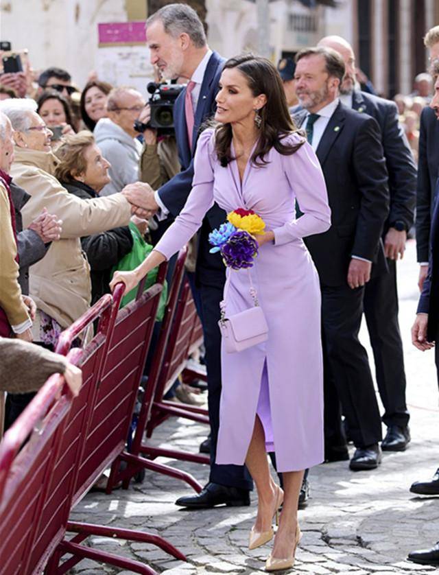 2023年3月27日,莱蒂齐亚在加的斯会见时,选择了全丁香色,穿着一件Cho Atelier淡紫色连衣裙,搭配奥利维亚·马雷克淡紫色包,裸色的高跟鞋,使其提升气质。