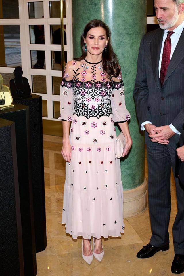 2023年2月20日,莱蒂齐亚穿了一条伦敦图案的粉色连衣裙,她在国家文化奖上的穿搭风格,显得华丽且时尚。
