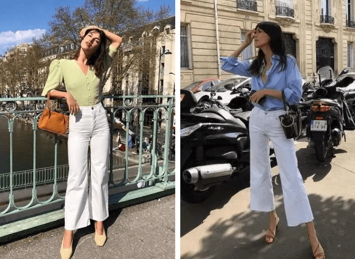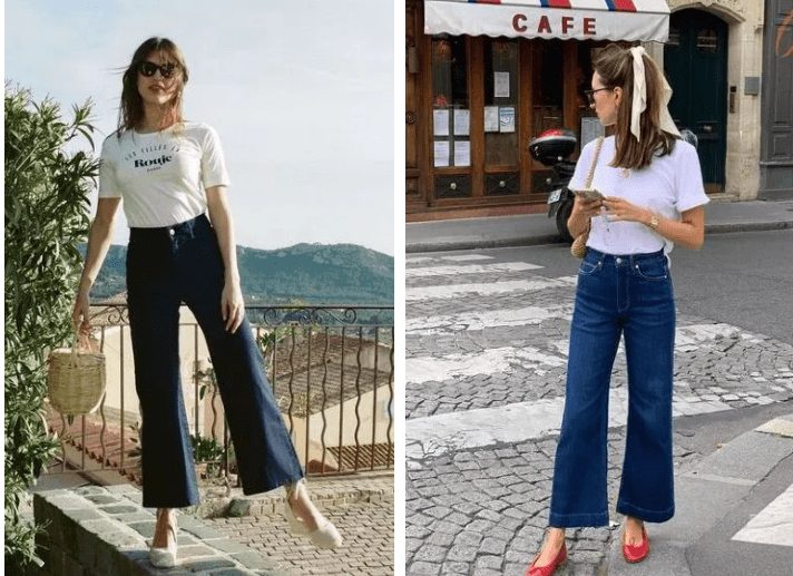 搭配法式喇叭裤,推荐选择修身的上衣,可以是一件贴身的T恤或者是短款的毛衣,然后再搭配一双高跟鞋,整个人看起来都会显得非常高挑。