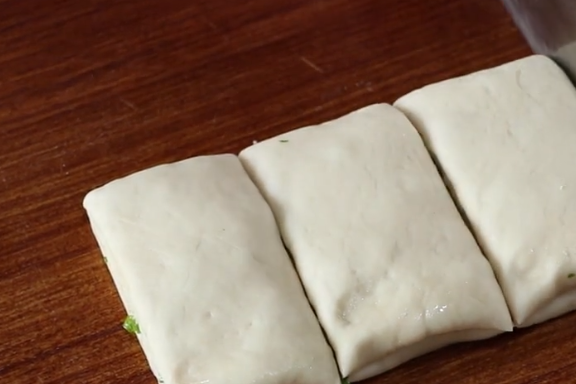 面团松弛时间到了之后,将面团一切为二。在案板上撒上一层干面粉,取一块面团放在案板上,擀成0.5厘米左右后的长方形面饼。