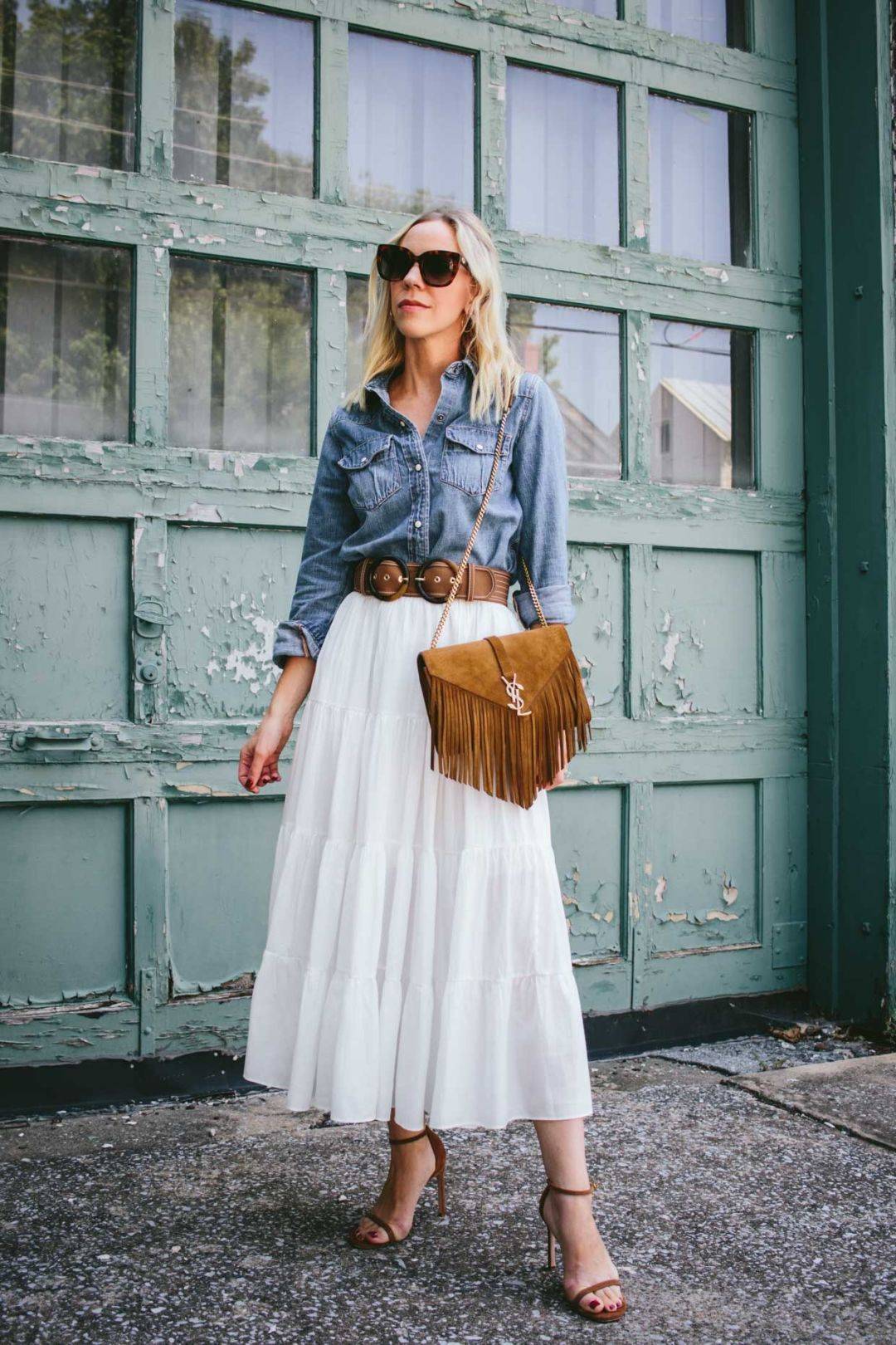把衬衫换成牛仔的,你会发现这条裙子其实很适合走波西米亚风,加一点麂皮单品味道更正。