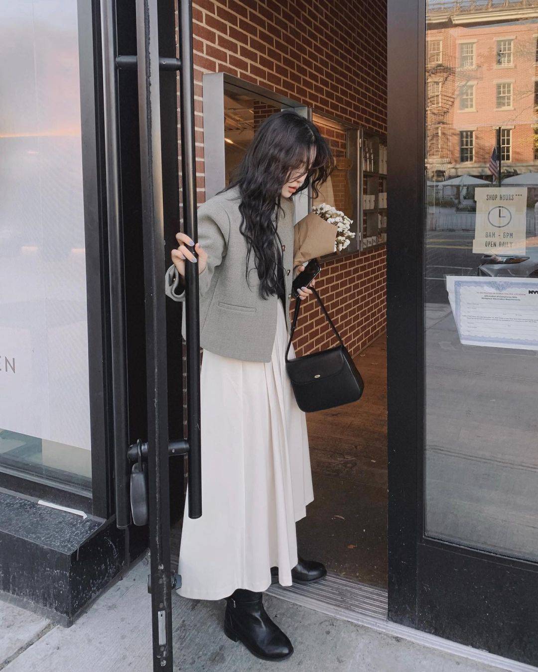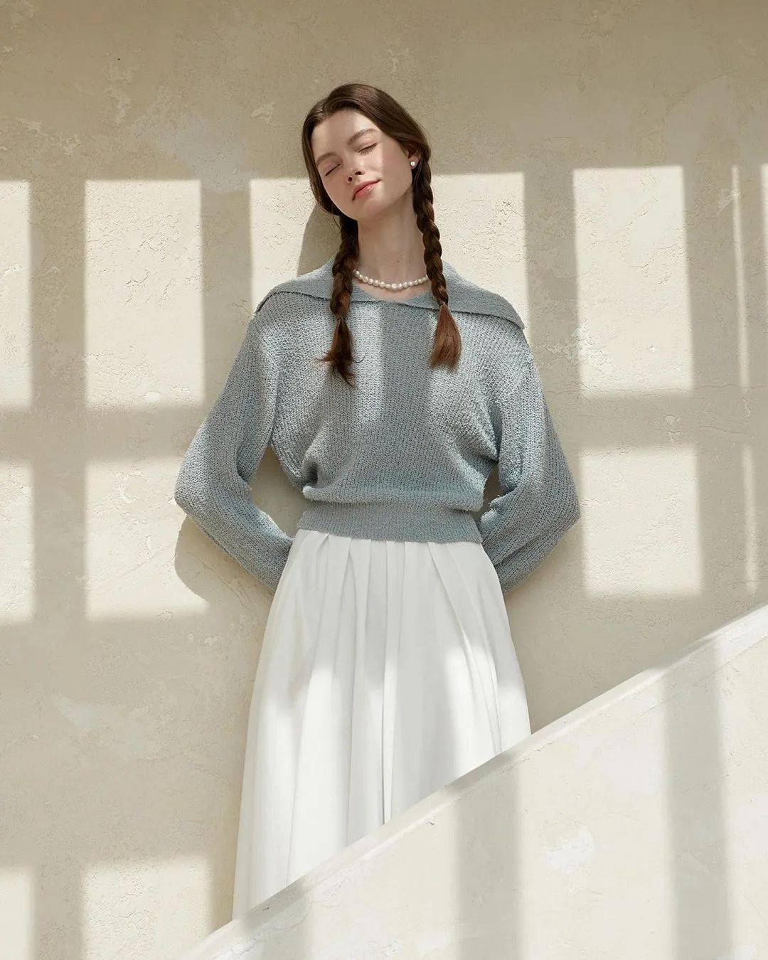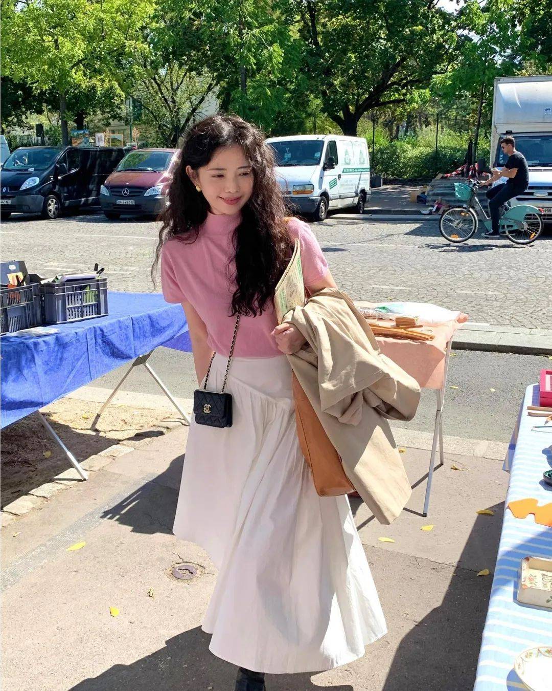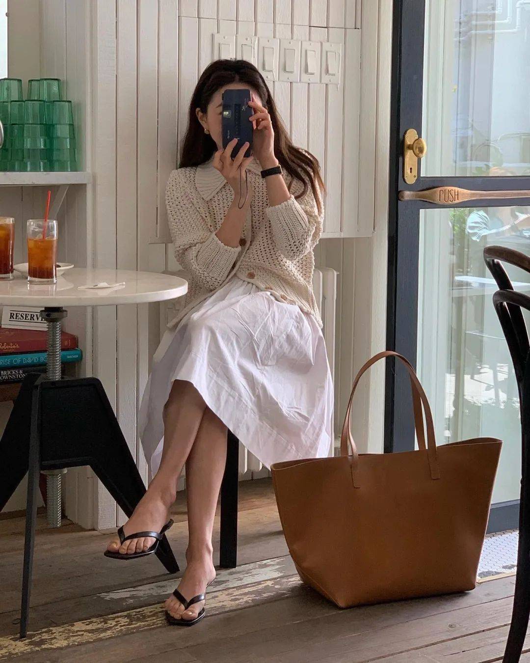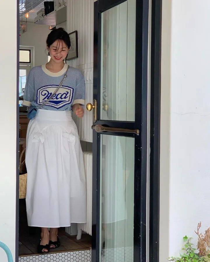 虽然比伞裙日常,但今年流行的小白裙裙摆还是偏大的,整体可以遵循“上紧下松”的原则,选一件修身的针织衫。