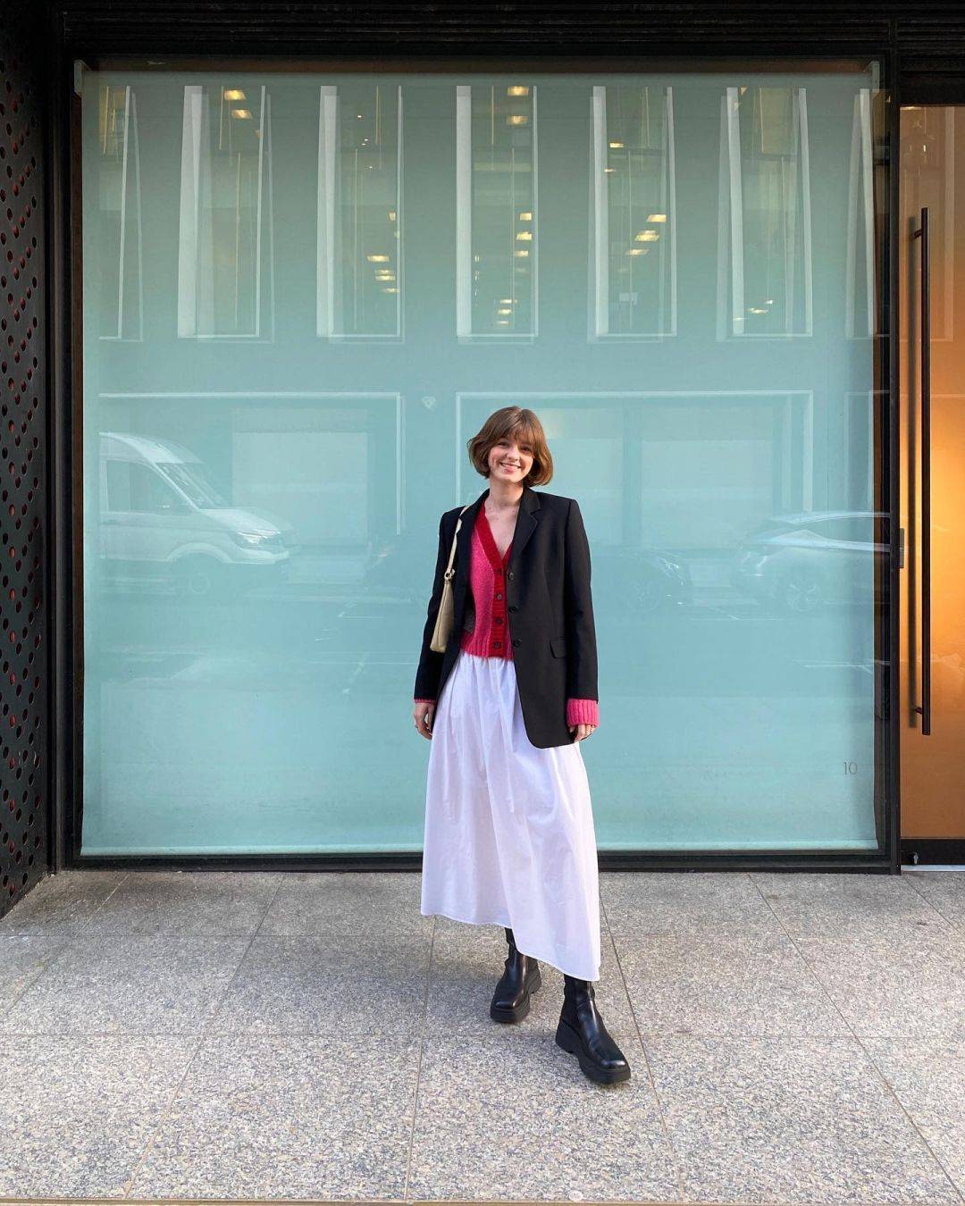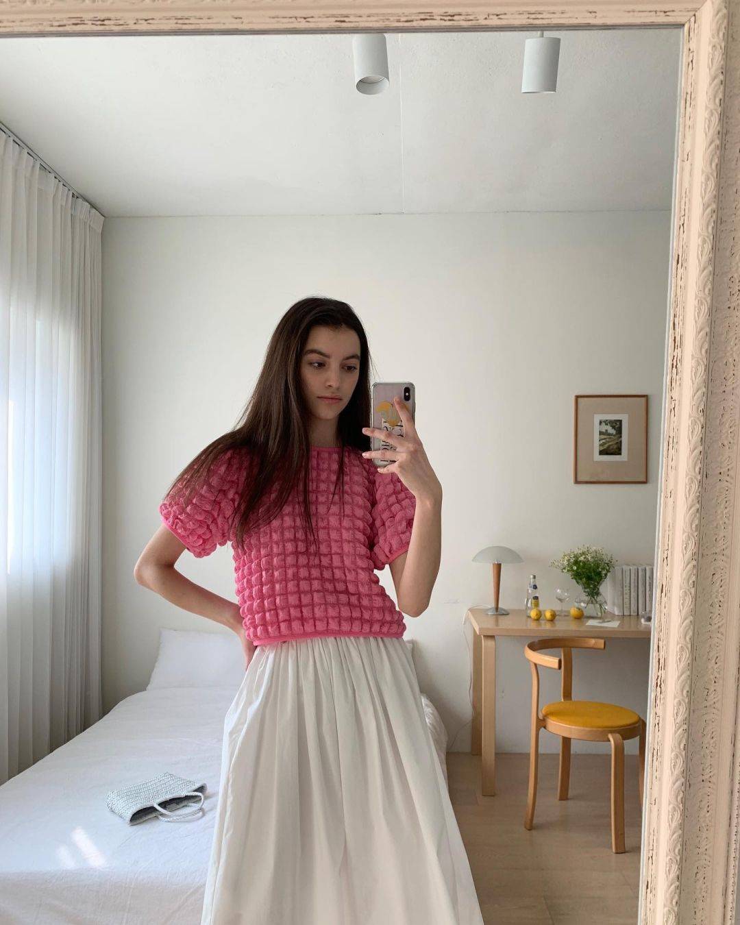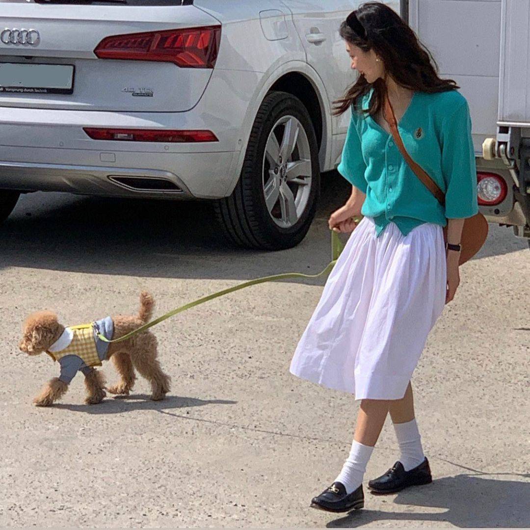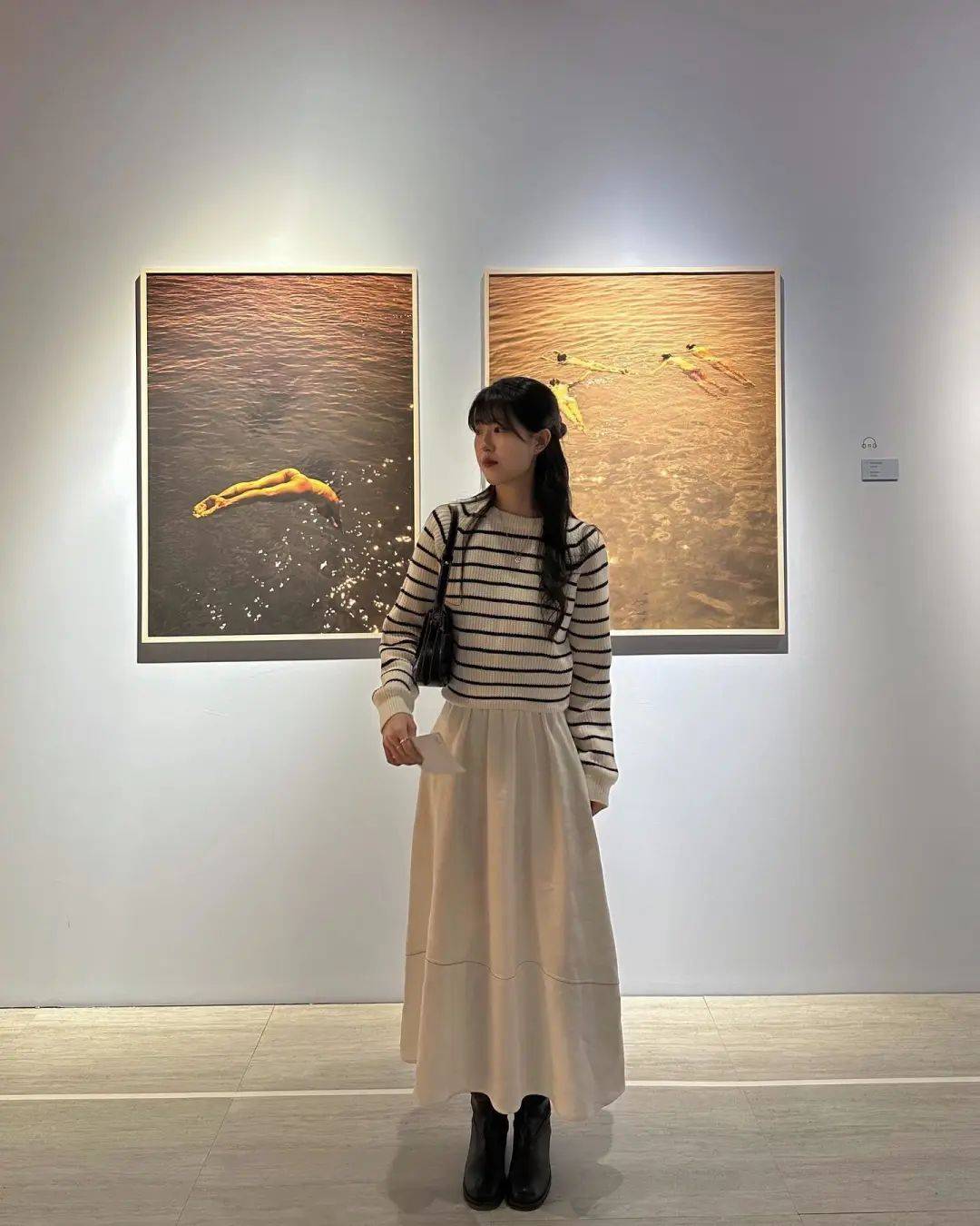虽然比伞裙日常,但今年流行的小白裙裙摆还是偏大的,整体可以遵循“上紧下松”的原则,选一件修身的针织衫。