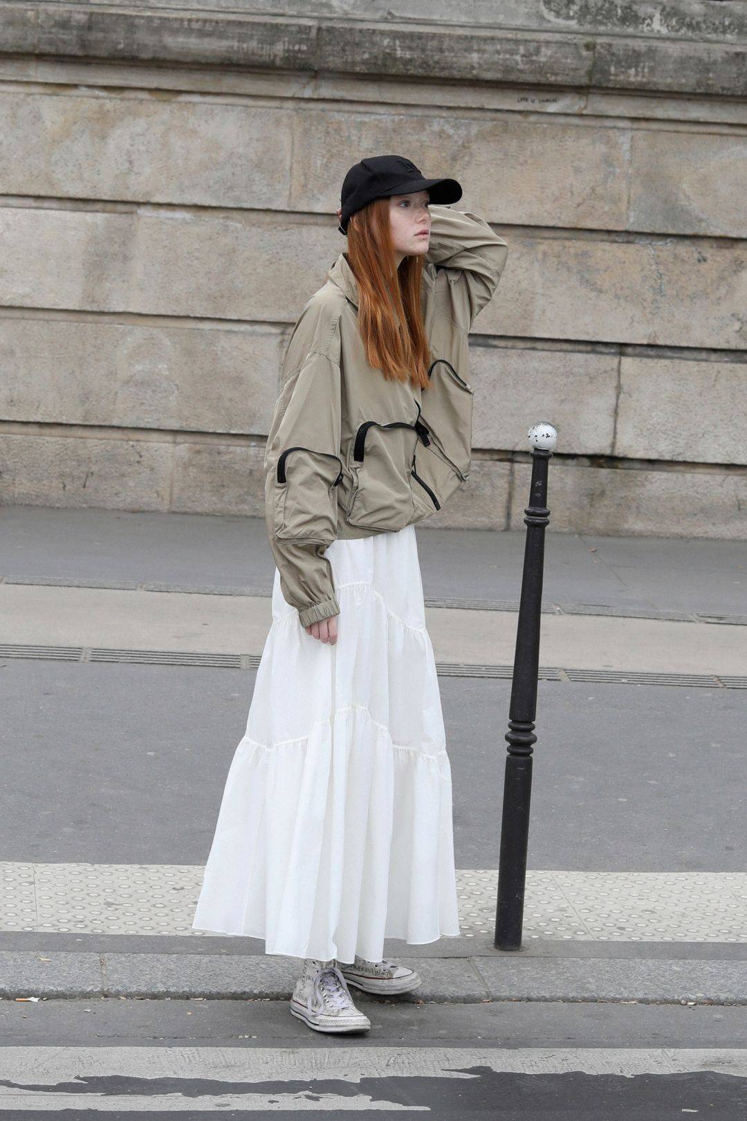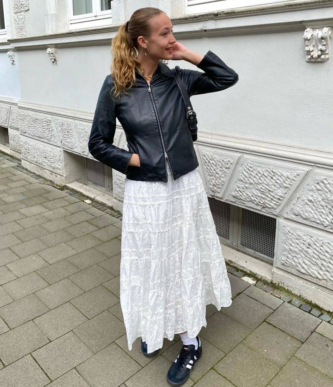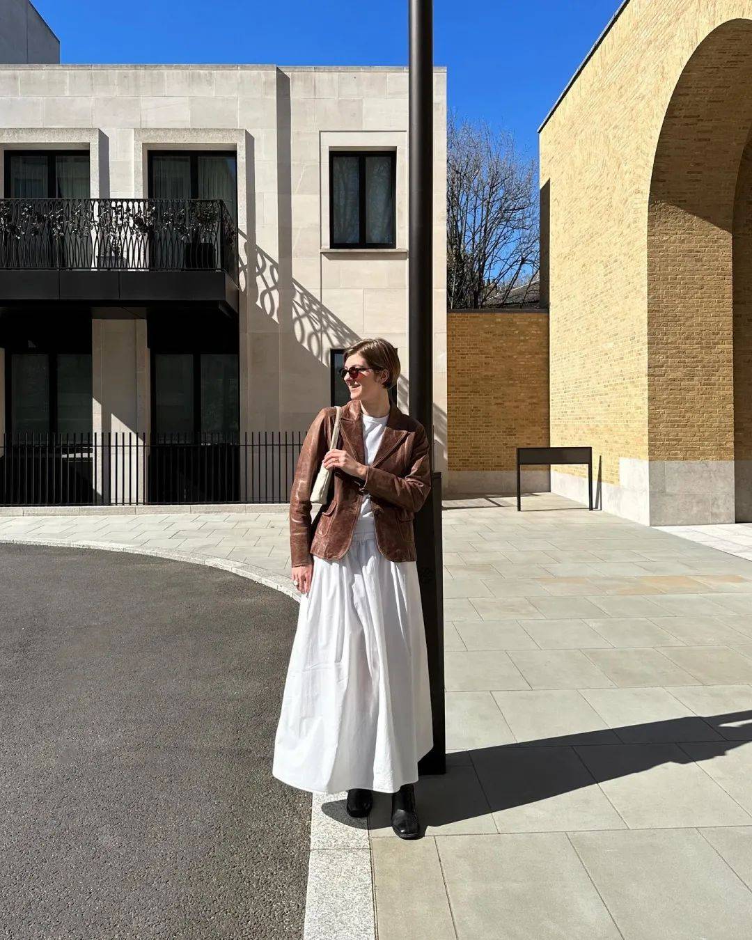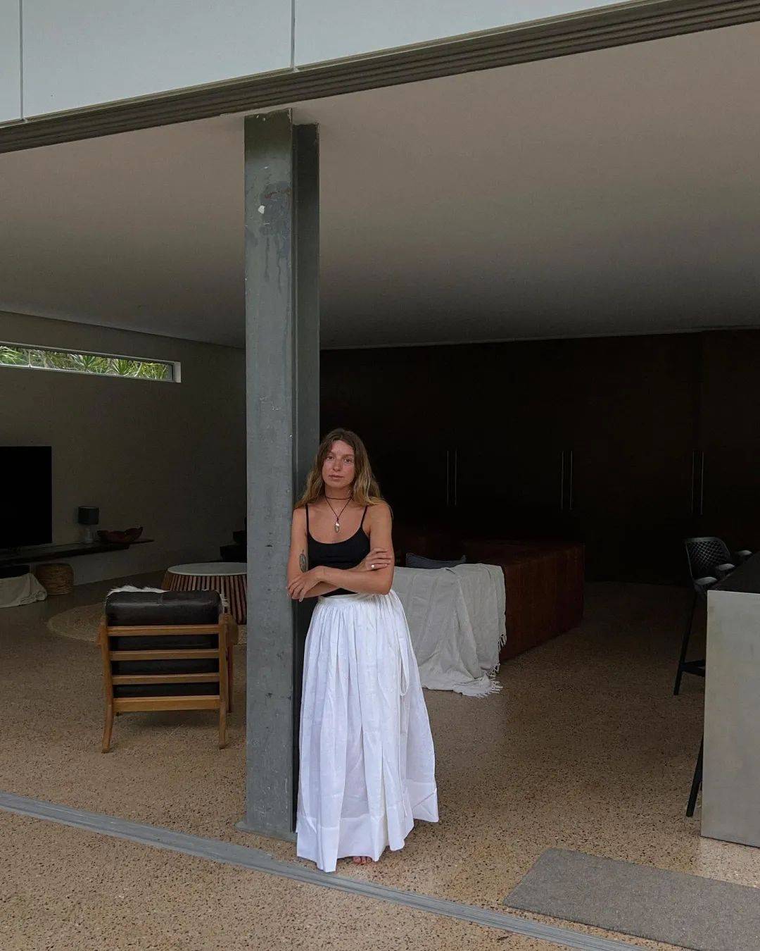 这种白色长裙自带休闲放松的一面,搭一件酷酷的T恤,就很街头休闲风。