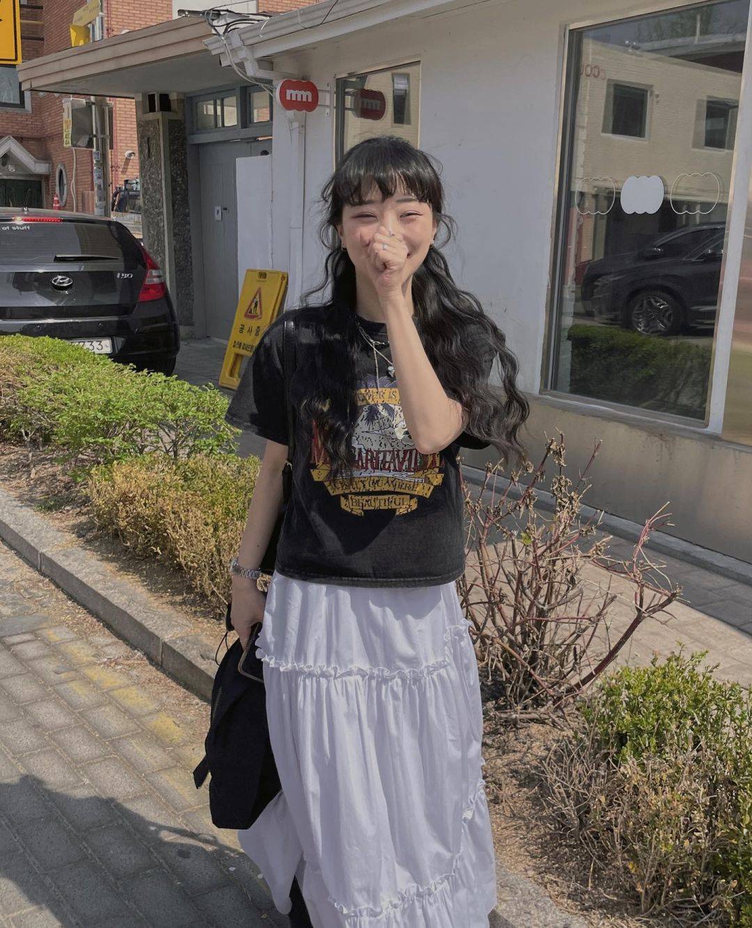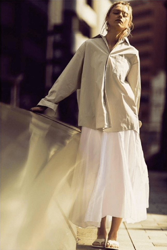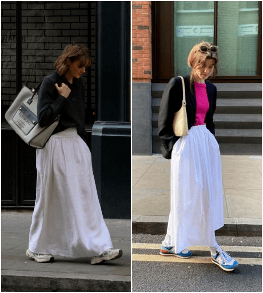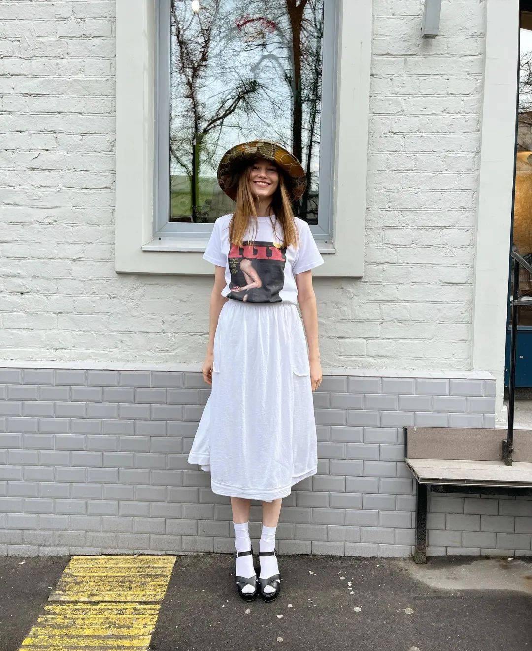 这种白色长裙自带休闲放松的一面,搭一件酷酷的T恤,就很街头休闲风。