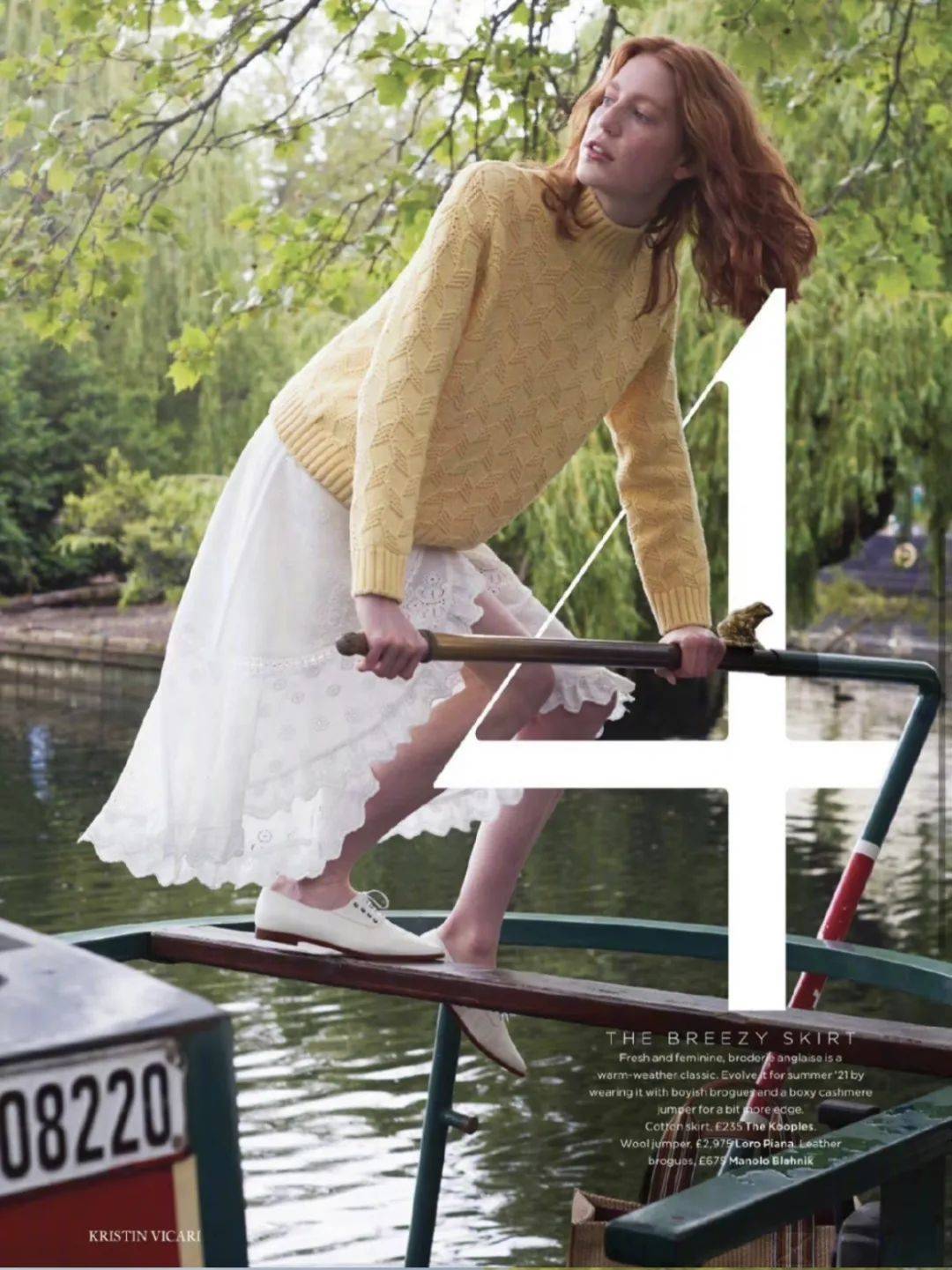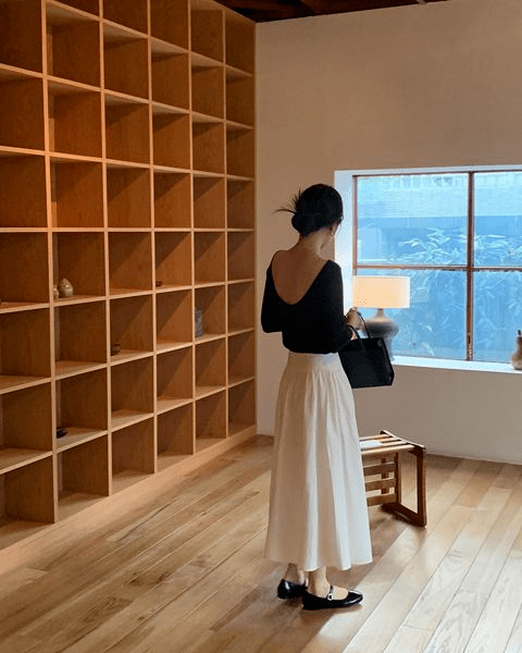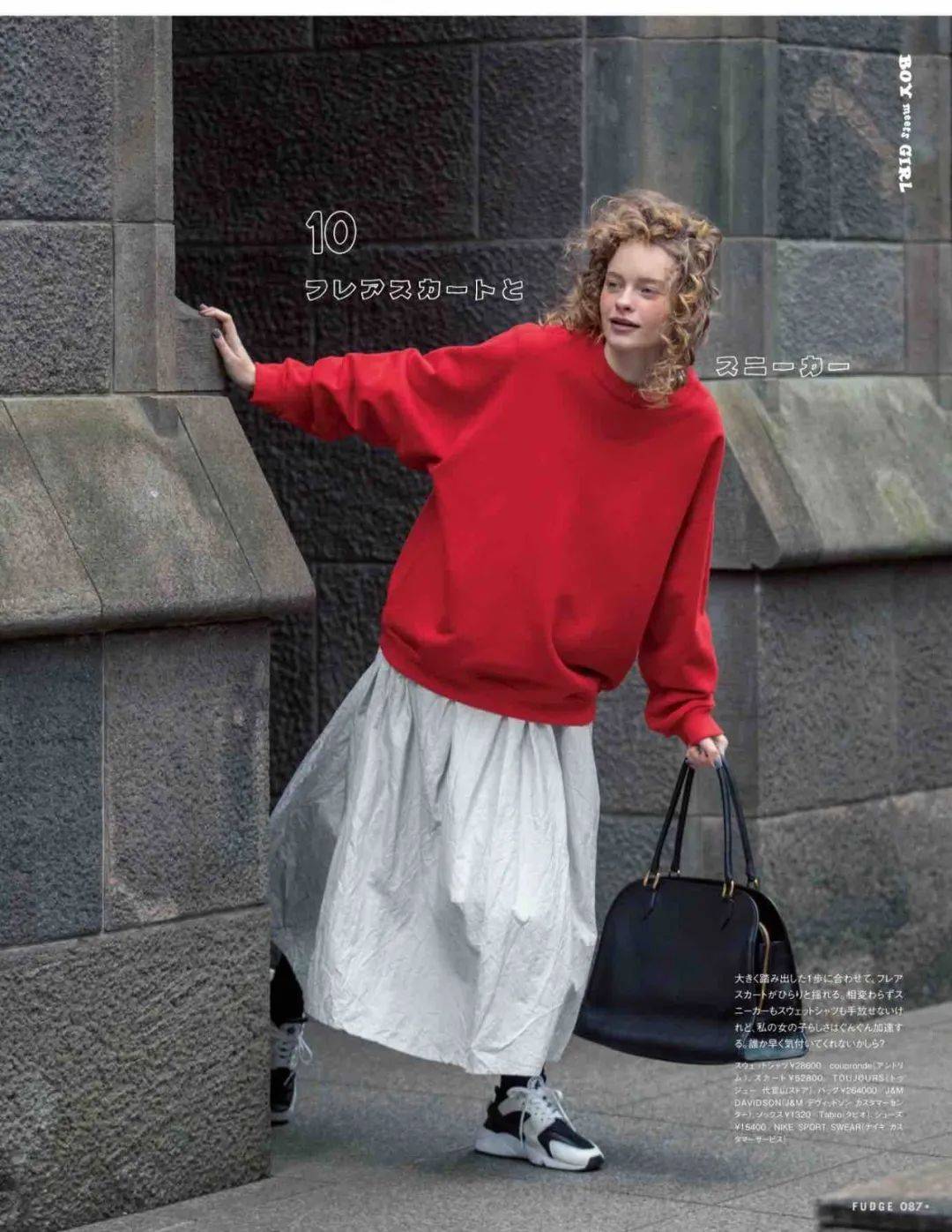 这种大领口针织衫有点芭蕾风,很优雅,想要更复古一点,记得加上一双玛丽珍鞋。