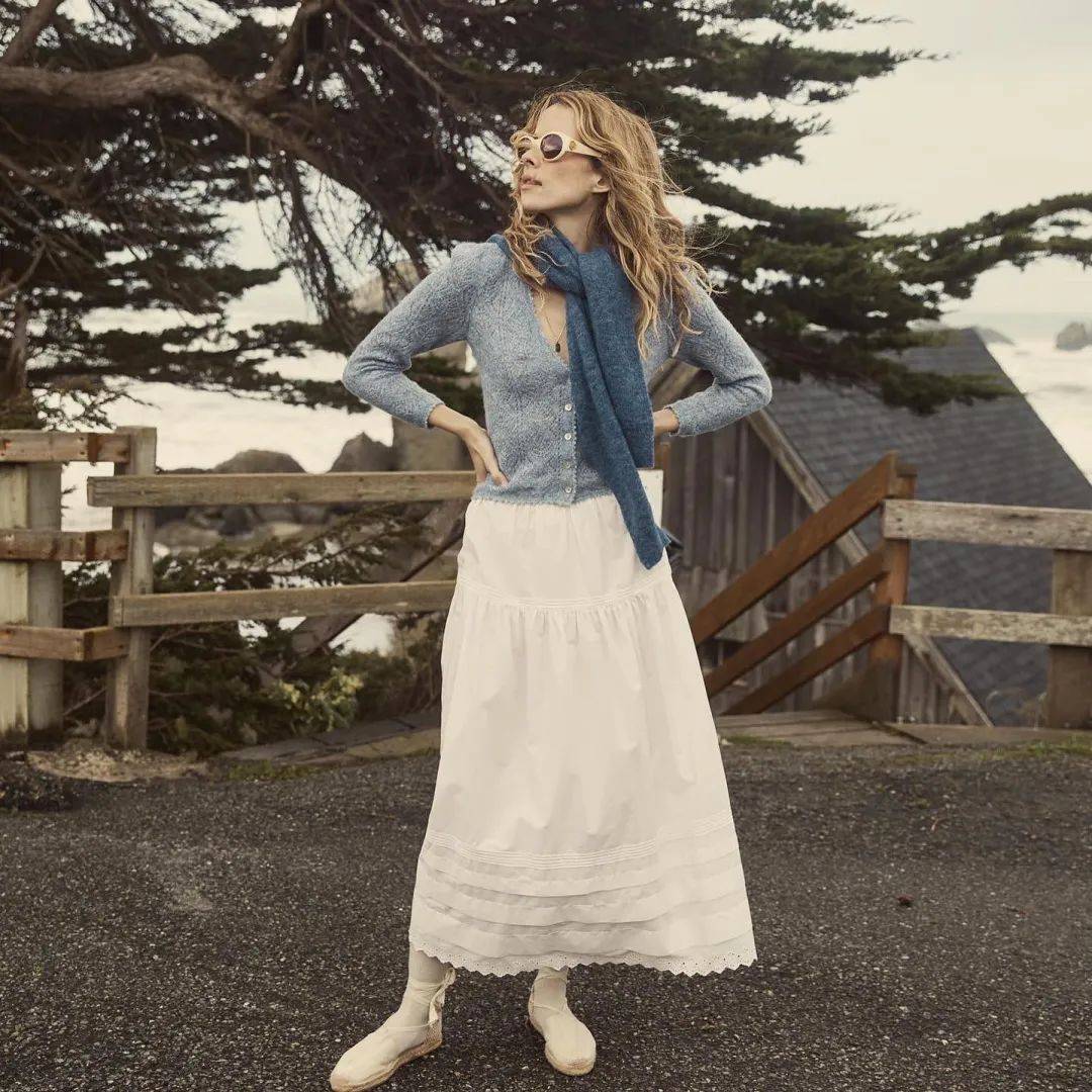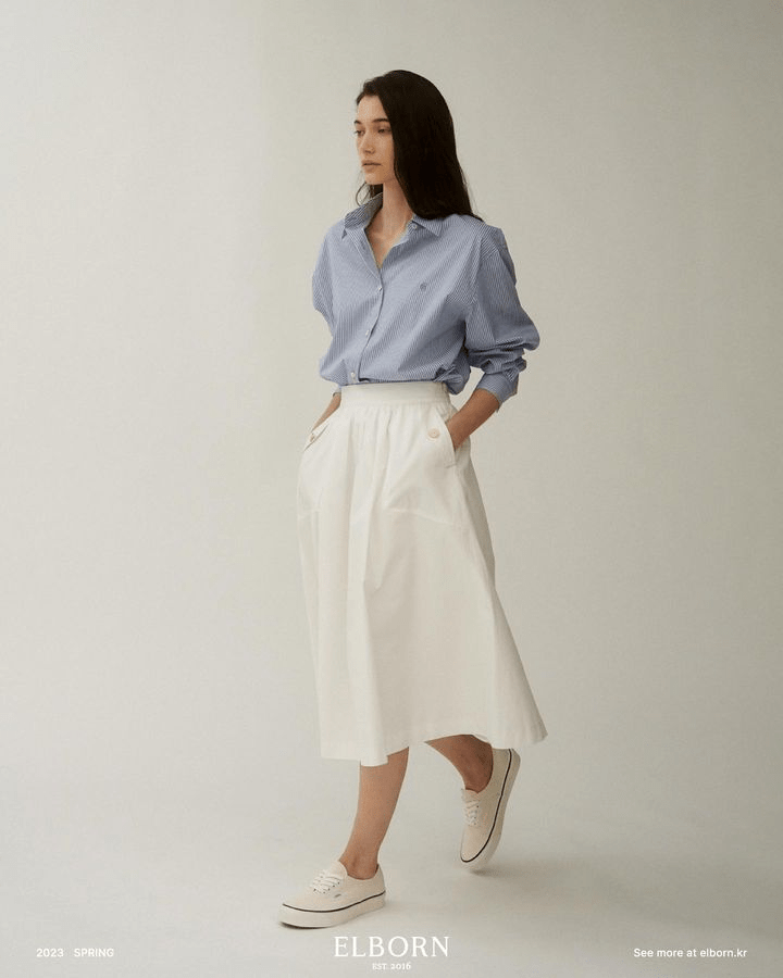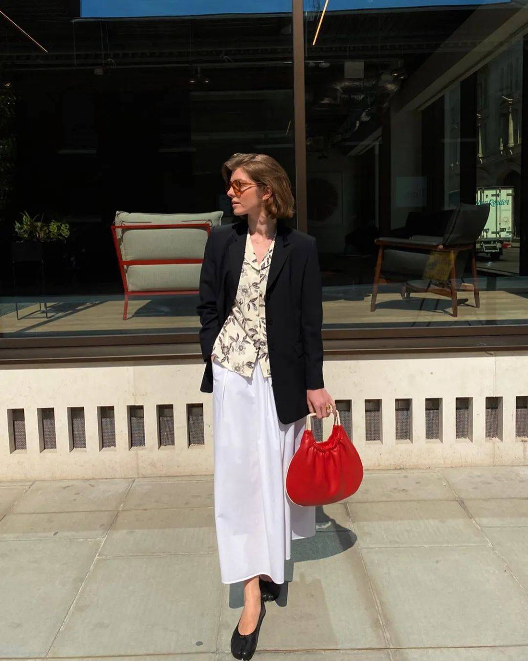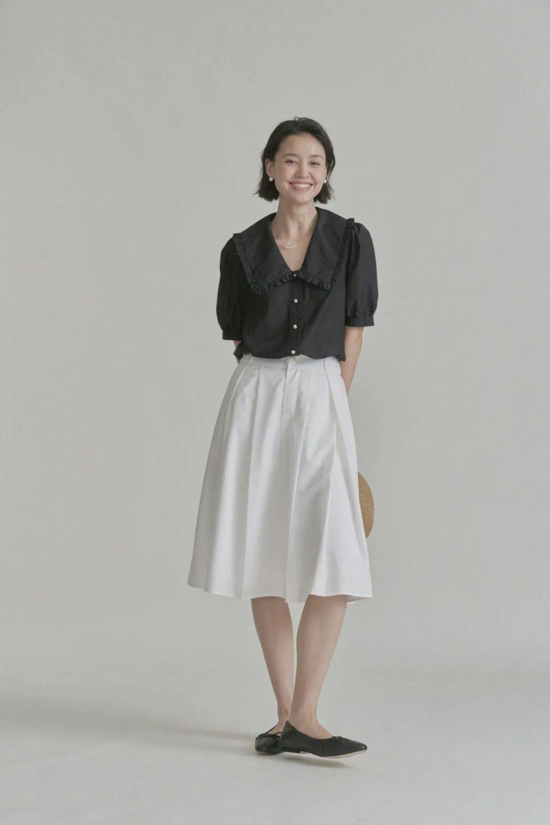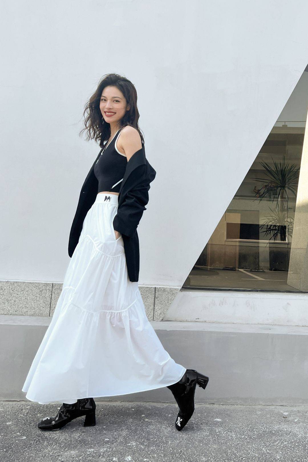 现在流行的这条白色半裙,介于A字裙和伞裙之间,它保留了伞裙浪漫的调调, 有点蓬松,又比较休闲随性,更加日常好穿。